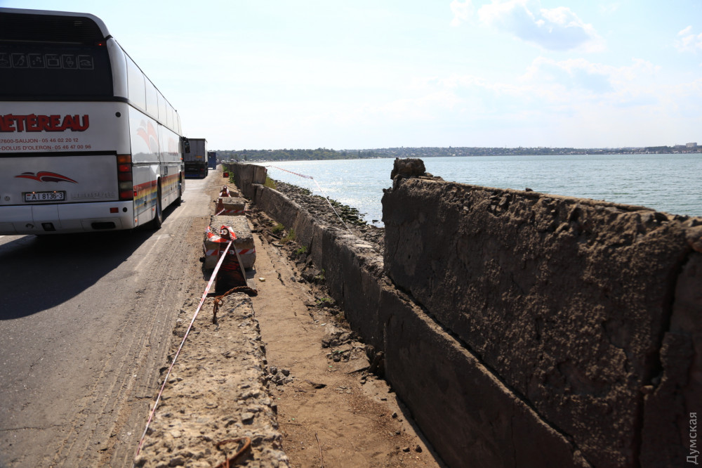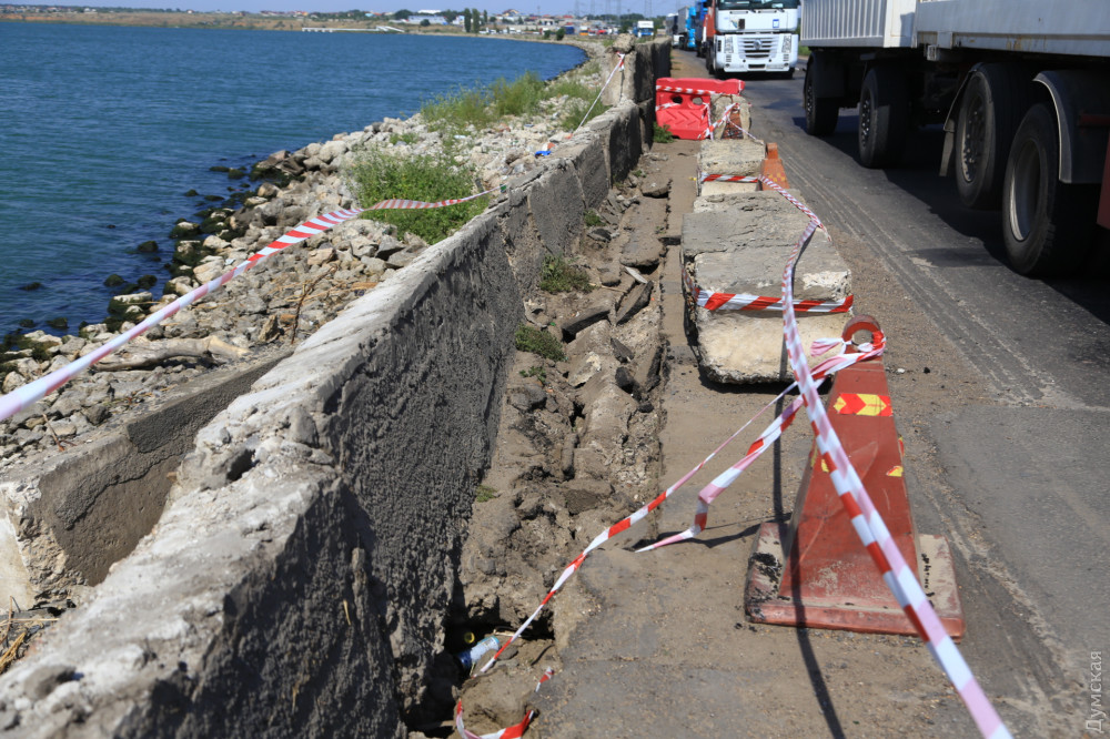 Остаток дороги длиной более километра состоит из старых блоков, сложенных вдвое. Состояние их крайне плохое, и в некоторых местах блоки упали. В одном из таких мест сегодня работала совместная комиссия мэрии и ОГА. Чиновники рассказали, что прошлой ночью тут случилось ДТП - большегруз повредил участок дамбы, в результате чего разрушилось около десяти метров сооружения.