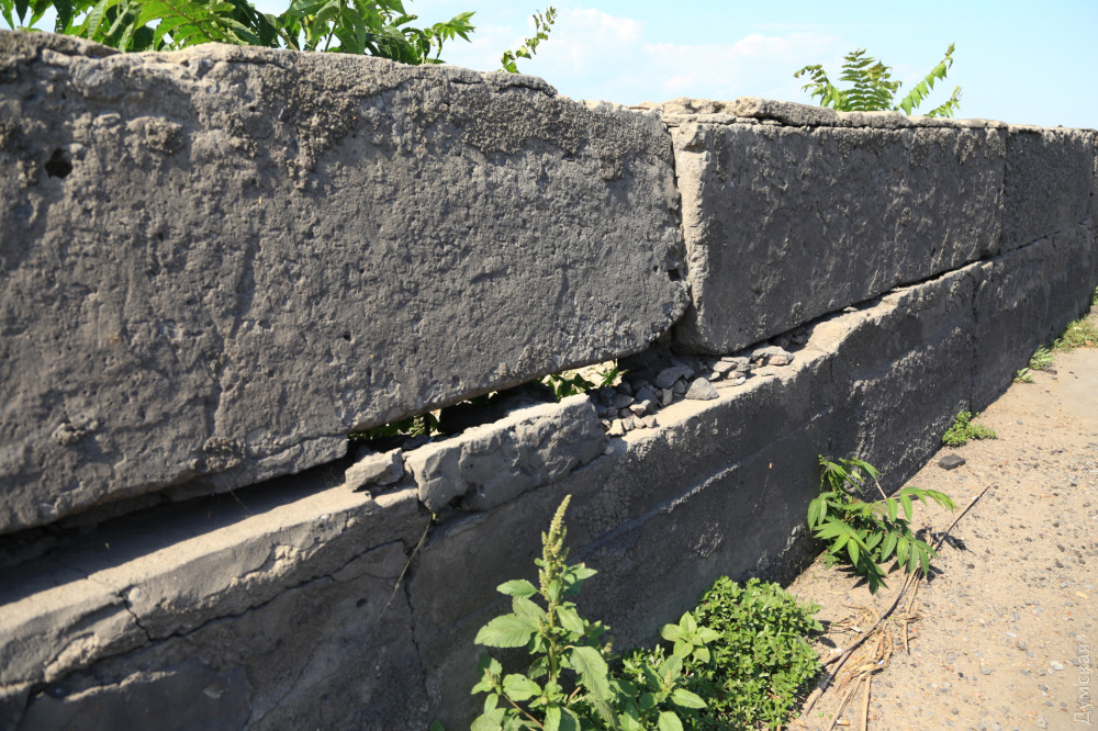 Следующие полкилометра уже похожи на настоящую дамбу. Здесь лежат два слоя стандартных бетонных блоков. Высота конструкции около метра, но на всем протяжении этот участок находится в плачевном состоянии. Раствор, который когда-то соединял блоки, осыпается, обнажая щели. Верхний ряд блоков во многих местах покосился, и достаточно не очень сильного удара, чтобы он упал.