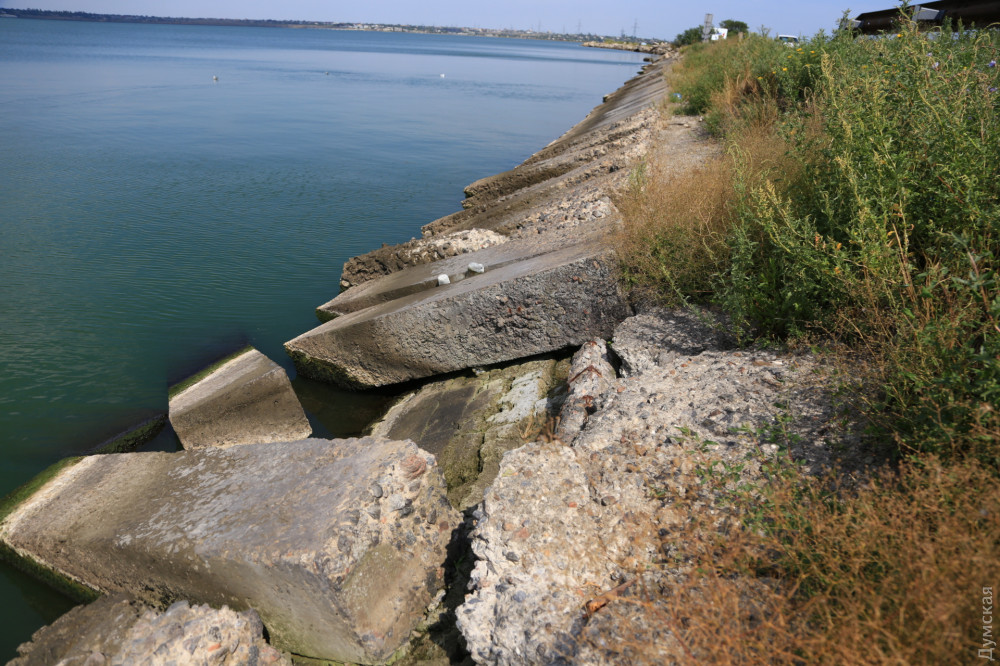 Если двигаться от Усатова к поселку Котовского, то первые 500 метров так называемой дамбы практически не защищены от наводнения. Здесь уложены небольшие бетонные плиты, которые во многих местах начали разрушаться. Под разрушенными плитами виднеется старый слой известняковой кладки. Ей не меньше ста лет, но разрушений не видно.