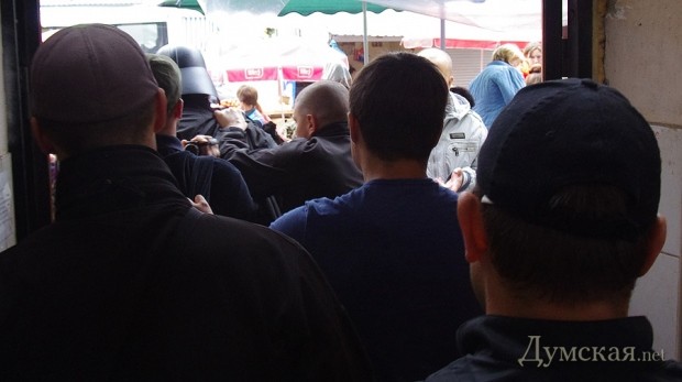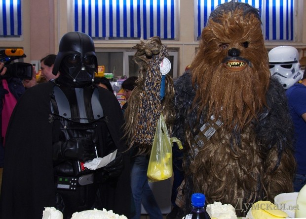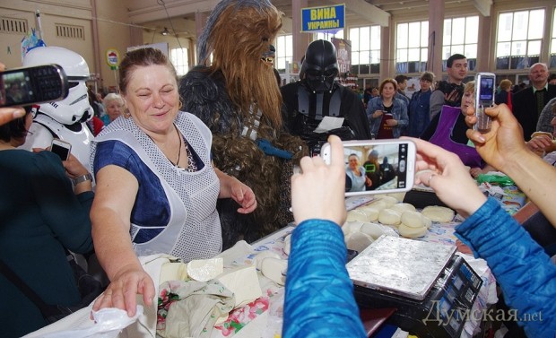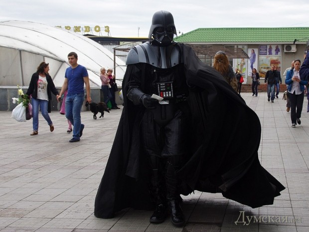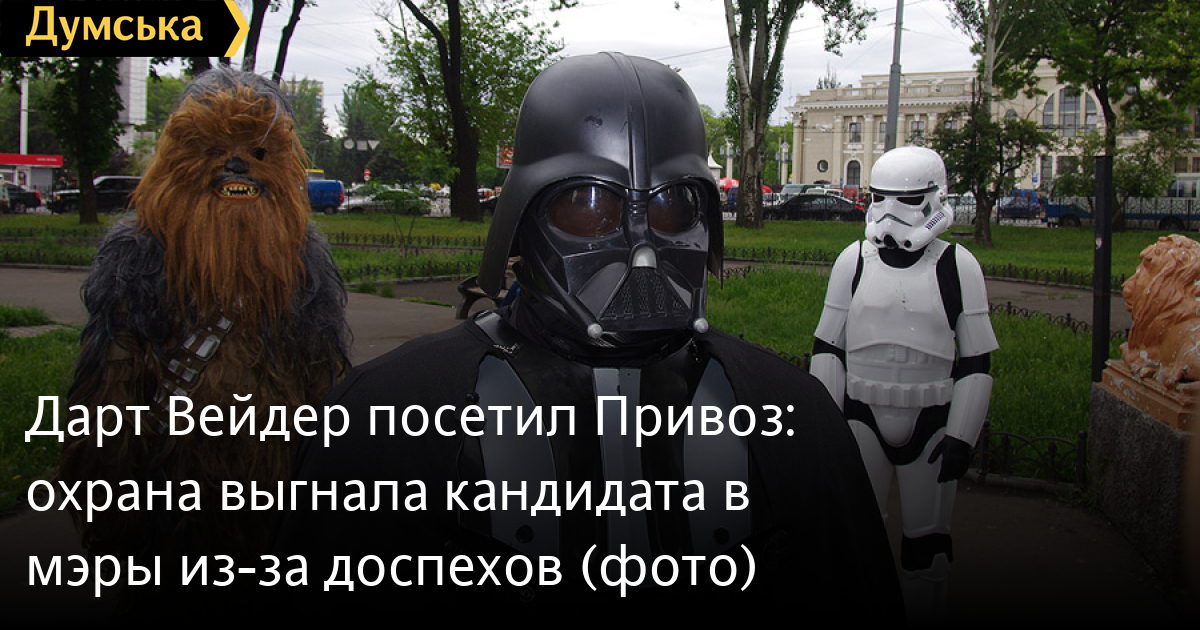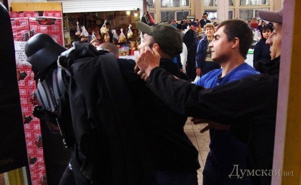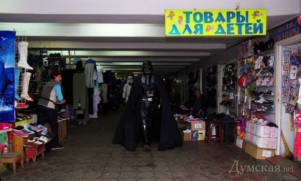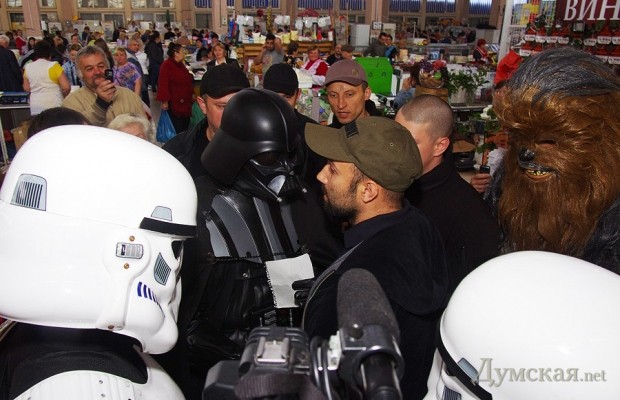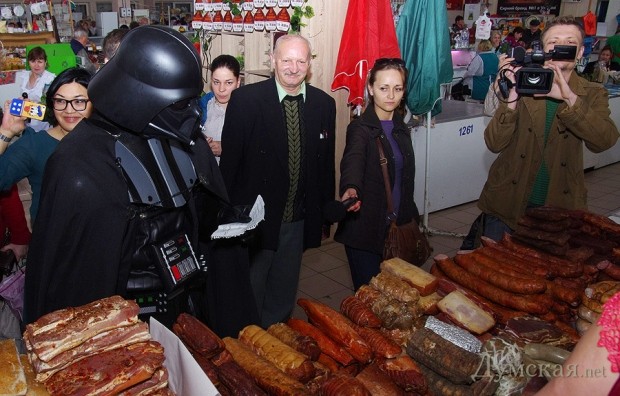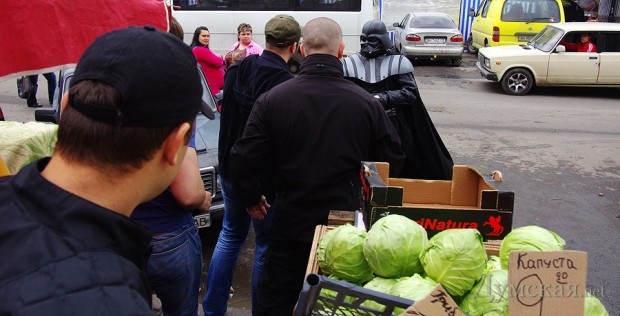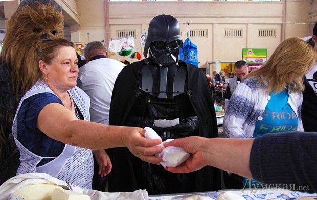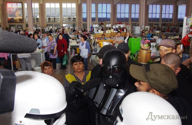 Дарт Вейдер купил сало, творог, топинамбур и уличил продавцов в недовесе. После небольшой перепалки охрана выпихнула кандидата на пост мэра Одессы из мясного корпуса. Охранники заявили темному лорду, что он не может больше находиться на территории рынка, поскольку он и его свита — в масках, а это противоречит распоряжению губернатора. Видимо, бдительные стражи рыночного порядка не знакомы с классикой и не знают, что Дарт Вейдер никогда не разлучается с доспехами — это опасно для его жизни.