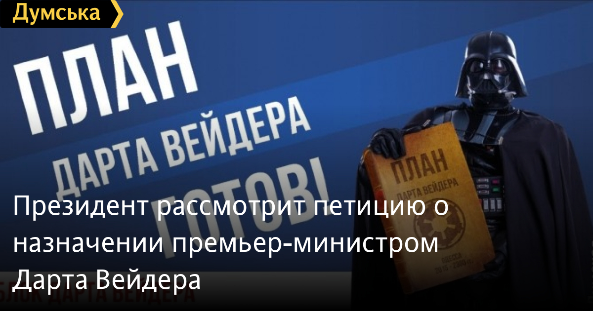 Электронная петиция о назначении Дарта Вейдера премьер-министром Украины, размещенная на сайте президента, будет направлена на рассмотрение главы государства. Инициатива Магистра Йоды в кратчайшие сроки собрала 25 тысяч подписей.
