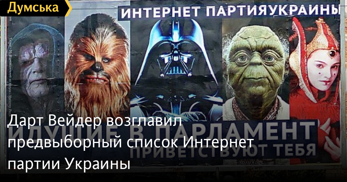 В первую пятерку списка Интернет партии вошли директор ООО «Темная сторона силы» Дарт Вейдер, директор «Палпатин финанс групп» Император Палпатин, ведущий инженер Института технической теплофизики НАН Украины Степан Чубакка, безработная Амидала Падме и директор ООО «Сайменс ЛТД» Магистр Йода.