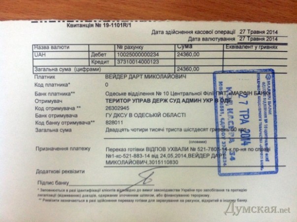 Владыка Ситхов Дарт Вейдер субсидировал украинскую судебную систему на сумму 24 тысячи 360 гривен, внесенных в качестве залога за освобождение солдат.