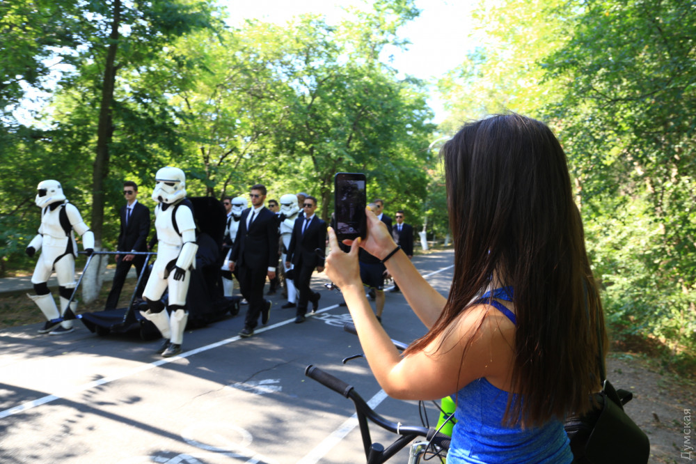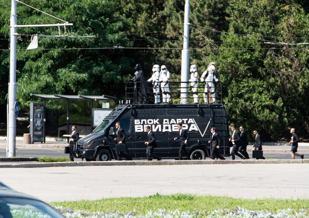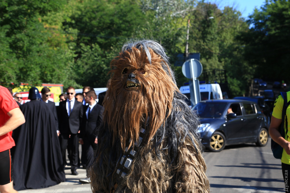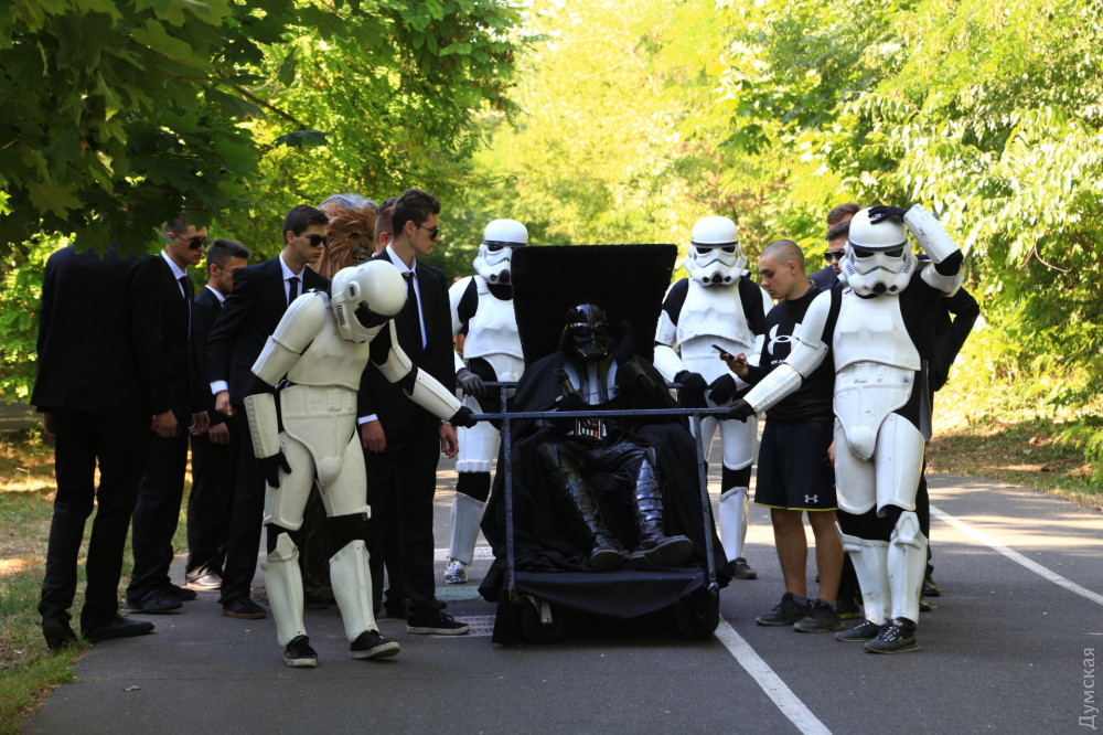 Темного повелителя сопровождала свита штурмовиков и Чубакка на Дартмобиле. Около часа ожидания ни к чему не привели — президент не приехал.