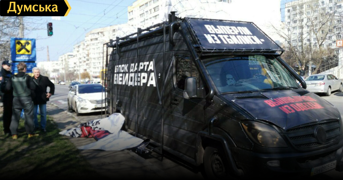 На этот раз сторонники главы ОГА помешали работе мобильного агитпункта, когда он разъезжал по Таирова. Они сорвали с него плакаты. Водитель микроавтобуса вызвал полицию, которая задержала одного из нападавших. Его высадили из «Тойоты Камри», которая целый день ездила за «вейдеромобилем».