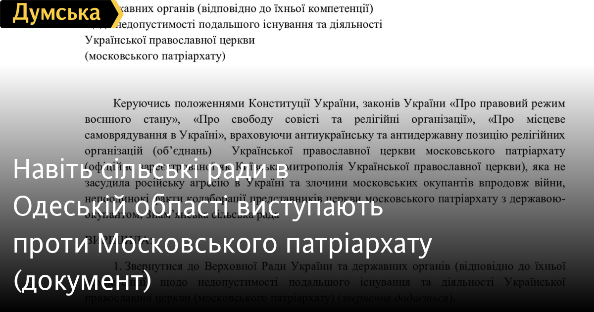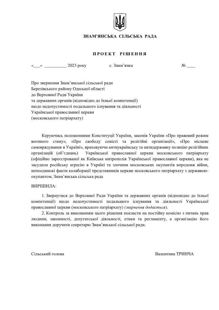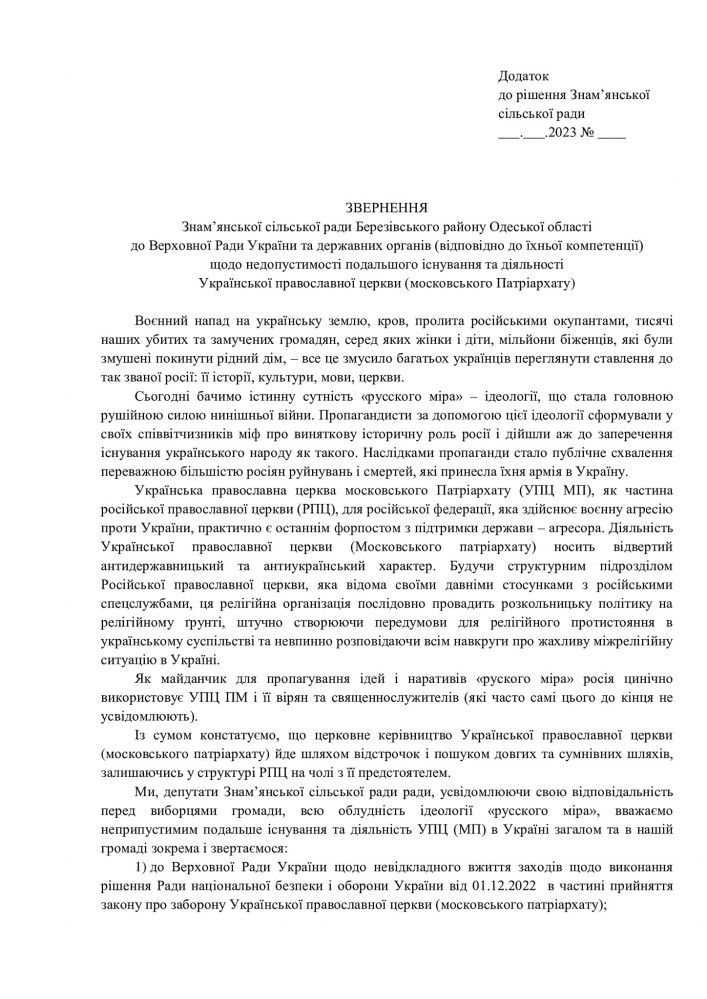 Звернення до Верховної Ради України та інших державних органів щодо недопущення подальшої діяльності Української православної церкви (Московського патріархату) ухвалила на позачерговому засіданні сесії 16 травня Знам'янська сільрада Березівського району Одеської області.