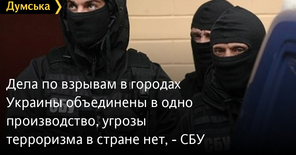 Уголовные дела по фактам четырех взрывов в Днепропетровске (27.04.2012 г.), Харькове (13.10.2011 г.), Запорожье (21.10.2011 г.) и Днепропетровске (16.11.2011 г.) объединены в одно производство. Также в это же производство добавлено уголовное дело по факту угрозы, размещенной 16 ноября прошлого года на одном из Интернет ресурсов, о возможном совершении взрывов в Донецке. Об этом сообщил на брифинге председатель Службы безопасности Украины Игорь Калинин.