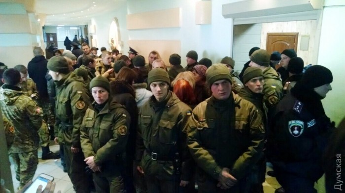 Заседание проходит за закрытыми дверями — публику и журналистов в зал не пускают бойцы Национальной гвардии. В фойе толпится народ.