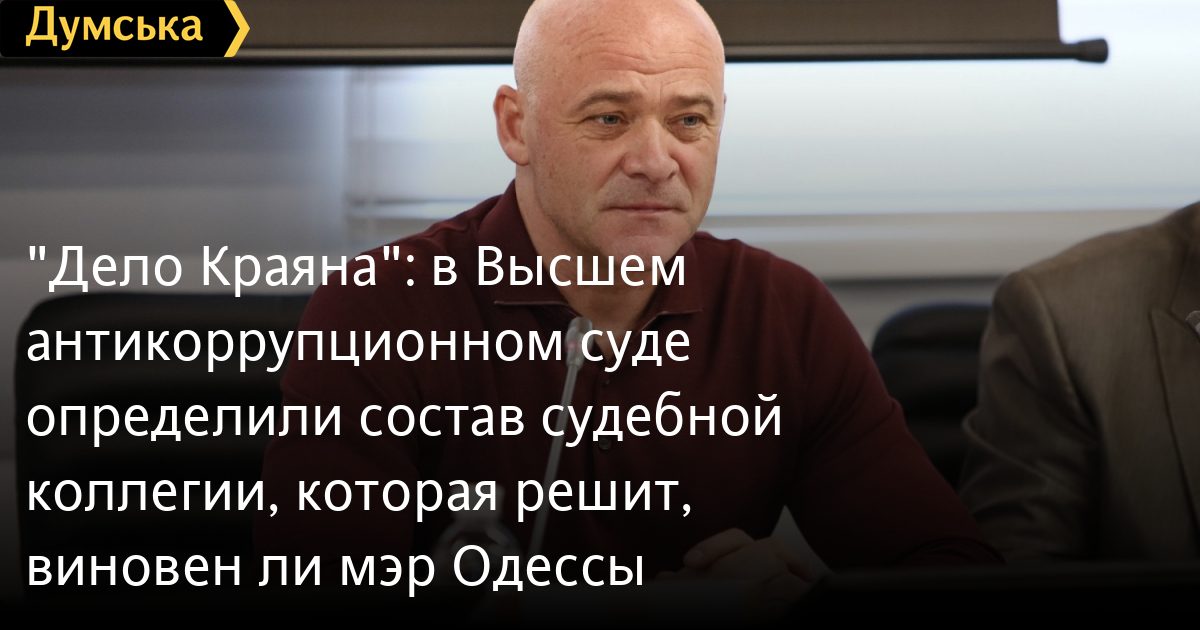 «Дело Краяна»: в Высшем антикоррупционном суде определили состав судебной коллегии, которая решит, виновен ли мэр ОдессыВ Высшем антикоррупционном суде Украины определили состав коллегии судей, которая будет рассматривать так называемое «дело Краяна» по обвинению мэра Одессы Геннадия Труханова и еще ряда лиц в присвоении средств городской громады. Как сообщили «Думской» в ВАКСУ, автоматизированная система распределила его на судей Олега Ткаченко (председатель коллегии), Виталия Дубаса и Олега Колиуша. Дата первого заседания пока не определена. Олег Ткаченко и Олег Колиуш в октябре прошлого года вынесли заочный приговор экс-судье Хозяйственного суда Одесской области Павлу Меденцеву, который уже вступил в силу. Его признали виновным в вымогательстве и получении крупной взятки и назначили наказания в виде лишения свободы сроком на девять лет. Правда, в настоящее время местонахождение бывшего судьи неизвестно: он в розыске с 2014 года. Что касается Виталия Дубаса, то он рассматривал одно из «декларационных» дел Геннадия Труханова и закрыл его в связи с решением Конституционного суда Украины, который признал неконституционной уголовную ответственность за недостоверное декларирование. Напомним, 11 февраля этого года апелляционная палата Высшего антикоррупционного суда Украины отменила оправдательный приговор Малиновского райсуда Одессы по «делу Краяна» и направила его на повторное рассмотрение в первой инстанции. На сей раз это будет уже Высший антикоррупционный суд. Обвиняемыми по «делу Краяна», кроме городского головы Одессы, проходят его заместитель Павел Вугельман, экс-глава постоянной комиссии горсовета по коммунальной собственности Василий Шкрябай, бывшие директор муниципального департамента коммунальной собственности Алексей Спектор и экс-заместитель Владимир Радионов, директор ООО «Девелопмент элит» (продавец админздания) Петр Загодиренко, директор ООО «Valton Group» Игорь Кравченко и директор предприятия «Брокбізнесконсалт» Галина Богданова (оценщик). Их действия квалифицировали по части 5 ст. 191 УК Украины — «завладение чужим имуществом путем злоупотребления служебным лицом своим служебным положением в особо крупных размерах, совершенное по предварительному сговору группой лиц». Как считает следствие, упомянутые лица организовали продажу городу админздания бывшего завода «Краян» по заведомо завышенной цене, в результате чего громада понесла убытки в размере 185 млн грн. В дальнейшем эти средства, вероятно, планировали легализовать через предприятие с признаками фиктивности, учредитель и руководитель которого, по данным НАБУ, проживает на временно оккупированной территории Луганской области. 9 июля 2019 года Малиновский райсуд оправдал всех обвиняемых. Специализированная антикоррупционная прокуратура обжаловала приговор в апелляционном порядке. СМЕРТЬ РОСІЙСЬКИМ ОКУПАНТАМ! Помітили помилку? Виділяйте слова з помилкою та натискайте control-enter