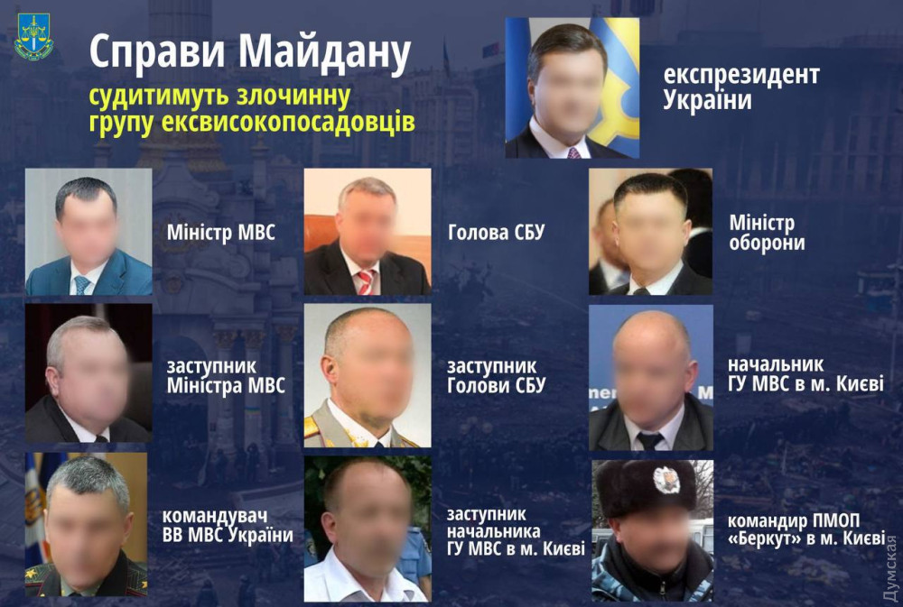 У Держбюро розслідувань повідомили, що заочні суди відбудуться над експрезидентом-втікачем Віктором Януковичем та ексміністром внутрішніх справ Віталієм Захарченком, заступником голови МВС Віктором Ратушняком, ексглавою СБУ Олександром Якименком, його колишнім першим заступником Володимиром Тоцьким, які обіймали посади під час його каденції, екс-міністром оборони України Павлом Лебедєвим, екскомандувачем внутрішніх військ Станіславом Шуляком, екс-виконувачем обов'язків начальника Головного управління Міністерства внутрішніх справ Києва Валерієм Мазаном, екс-заступником начальника ГУМВС Києва Сергієм Бойком, колишнім командиром київського полку спеціального призначення «Беркут» Сергієм Кусюком.
