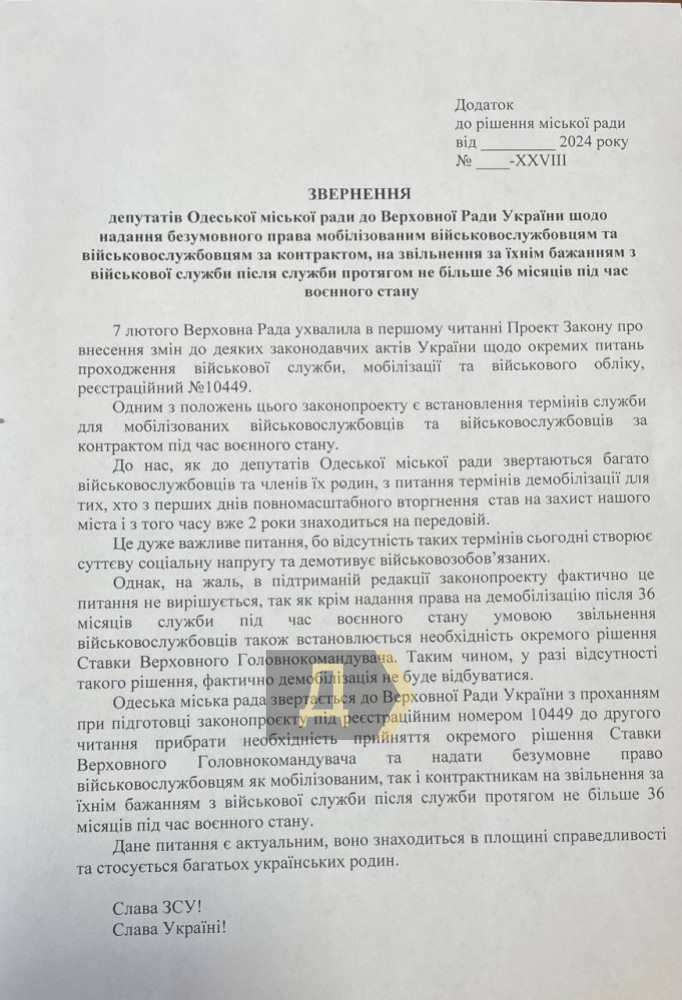 Прибрати із законопроєкту про мобілізацію норму про те, що демобілізація після 36 місяців служби відбуватиметься за рішенням Ставки, закликали Верховну Раду депутати Одеської міськради.