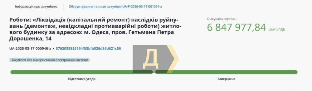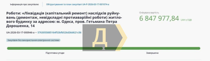 Демонтаж без аукциона и с нарушениями: в Одессе застопорился снос разрушенного домаПочти в семь миллионов гривен обойдется демонтаж дома в переулке гетмана Дорошенко, разрушенного в результате вражеского удара. Согласно решению областной комиссии, здание необходимо снести, так как оно представляет угрозу для окружающих, об этом говорится в документах опубликованных на портале Prozorro. По этой причине аукцион по выбору подрядчика не проводился. Департамент благоустройства уже заключил договор с компанией «СПК «ФЛАГМАН»». Однако начать работы пока не получится. Госаудиторская служба выявила признаки нарушений законодательства в сфере публичных закупок. Сейчас проводится мониторинг, по итогам которого будет решаться дальнейшая судьба договора. До завершения проверки работы не начнутся. Согласно дефектному акту, здание планируют демонтировать полностью: разберут надземную часть, фундаменты и дворовые покрытия. После этого участок очистят от мусора. Также предусмотрены земляные работы — разработка, засыпка грунта и уплотнение почвы. Компания «СПК «ФЛАГМАН»» зарегистрирована в 2017 году в поселке Хлебодарское Одесской области. Конечным бенефициаром является Дмитрий Фурман, руководителем с июня 2023 года — Александр Яковлев. В 2024–2025 годах компания активно участвовала в государственных тендерах: в 2024 году сумма выигранных контрактов превысила 28 миллионов гривен, а в 2025 году — уже более 75 миллионов. При этом ООО «СПК ФЛАГМАН» фигурирует в нескольких уголовных делах, связанных с хищением бюджетных средств и налоговыми махинациями. СМЕРТЬ РОССИЙСКИМ ОККУПАНТАМ! Заметили ошибку? Выделяйте слова с ошибкой и нажимайте control-enter |