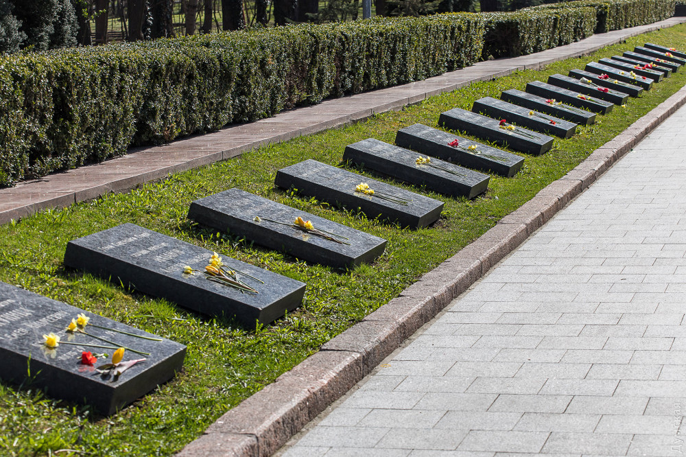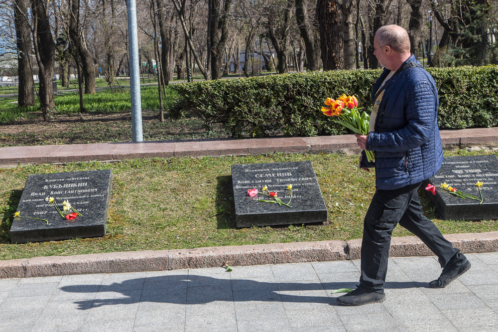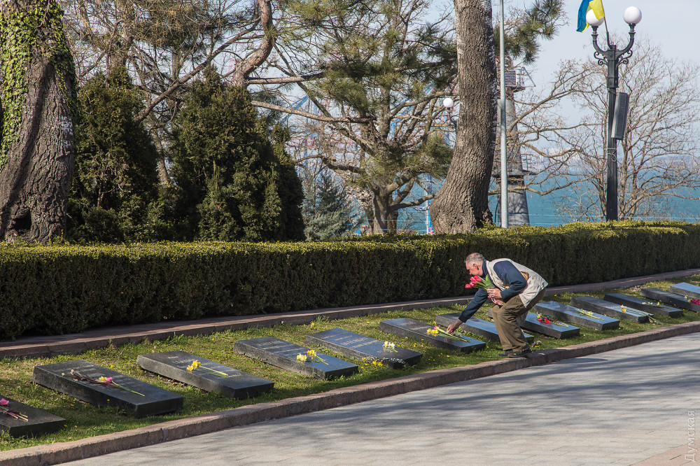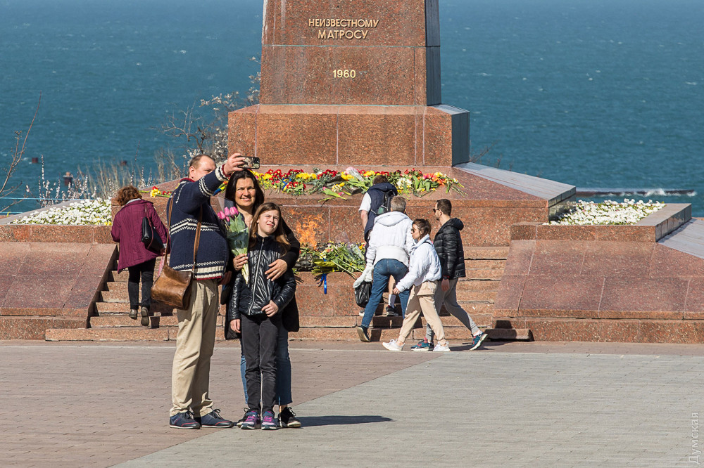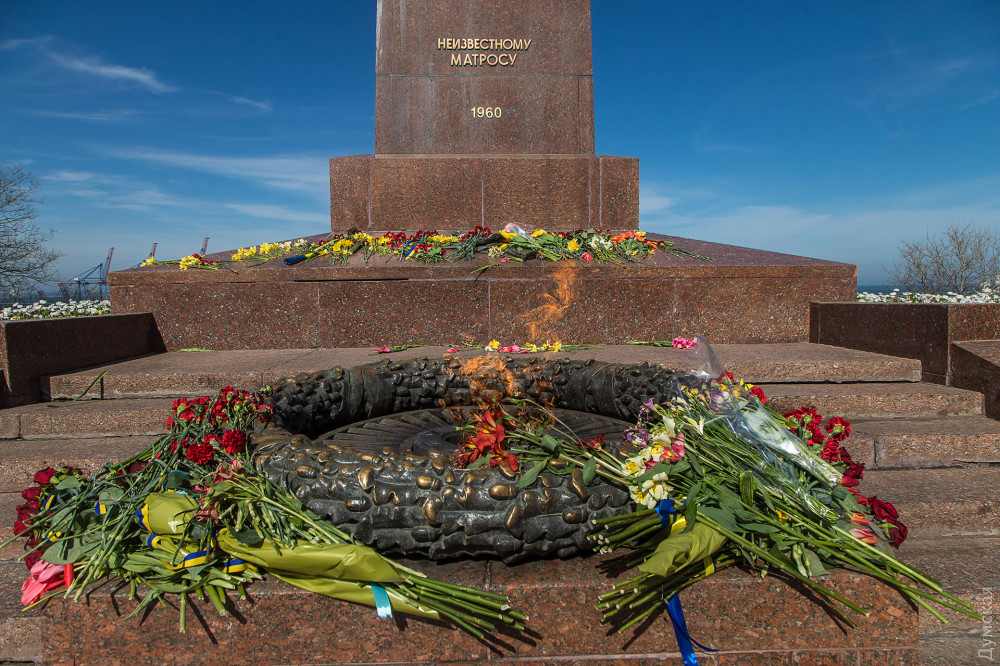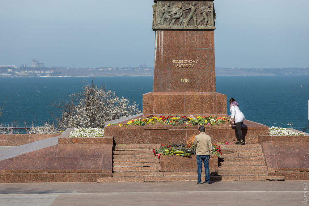 На постаменте мемориала Неизвестному матросу появились цветы — одесситы, понимая, что завтра почтить память погибших во Вторую мировую войну не получится, приходят сегодня.