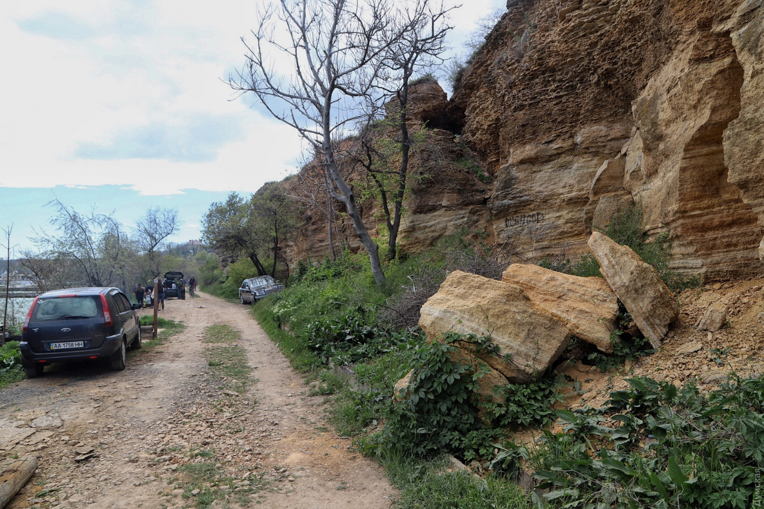 Оползень под санаторием ГСЧС продолжает расти. Но многотонный кусок склона, нависший над дорогой, которая ведет от Маячного переулка к Золотому Берегу, похоже, совсем не пугает одесситов. Некоторые жарят шашлыки как под ним, так и на верхней части террасы. От существующей трещины шириной в метр уже тянется новая — отсекающая от «материка» еще больший кусок породы.