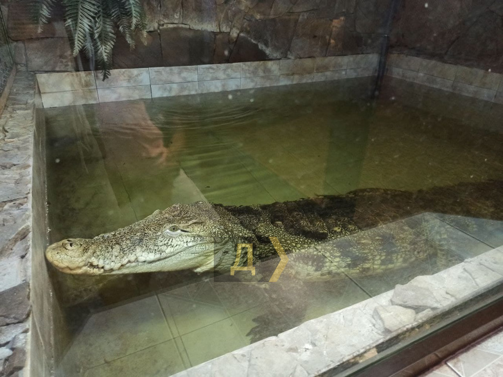 Следующий по списку зверь, за которым нам доверили поухаживать – нильский крокодил. Когда мы пришли в террариум, этот малыш весом под 100 кг релаксировал в своем мини-бассейне. Впрочем, даже в минуты расслабления этот хищник крайне сконцентрирован, а его зрачки, с какого угла на них не взгляни, всегда, кажется, следят за тобой. Нам предложили протереть стеклянный вольер рептилии. Казалось бы, что тут сложного? Но эта задача, признаться, далась нам нелегко.