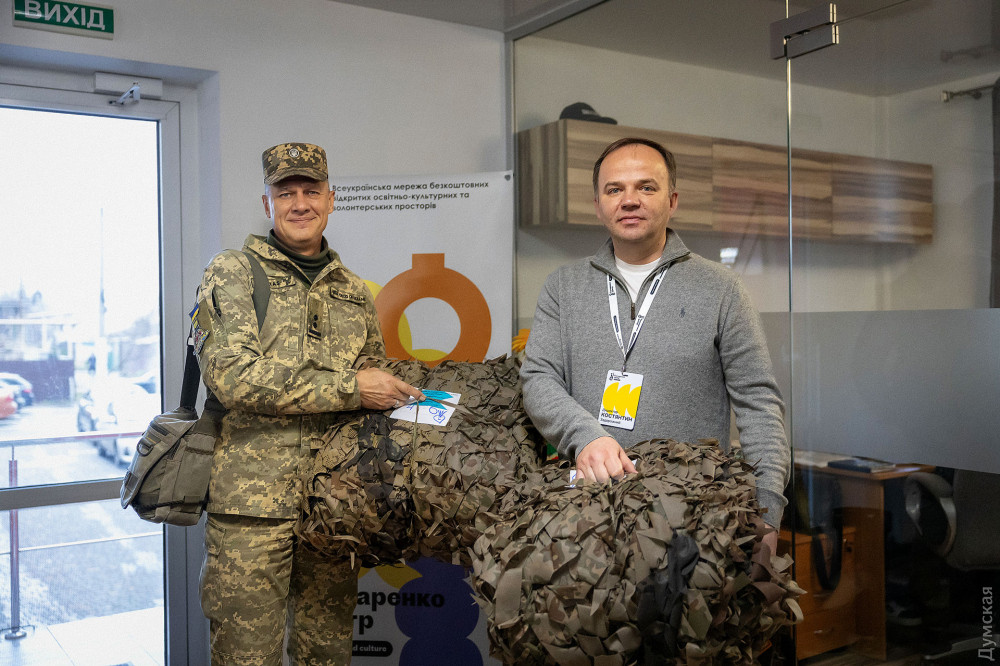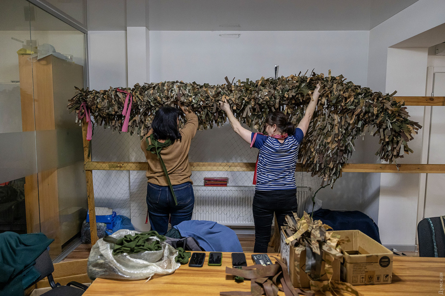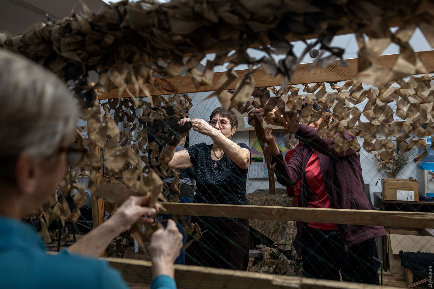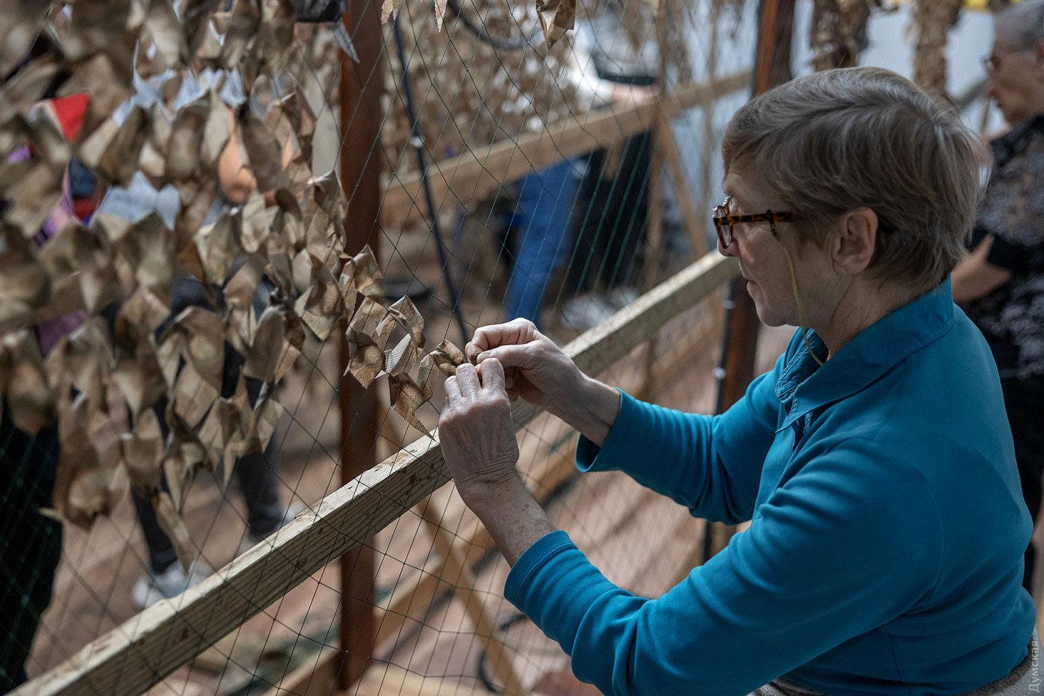 З перших днів повномасштабної війни волонтери підставили плече армії та державі. Поки одні йшли на фронт, інші закривали нескінченні дірки в забезпеченні, шили, плели, збирали, везли, рятували, знаходили потрібне в неможливих умовах. Завдяки тисячам рук по всій країні, оборона втрималася. І сьогодні, на четвертому році битви з російським злом, волонтери продовжують бути тим невидимим фронтом, який тримає країну в тонусі та допомагає ЗСУ виконувати свою роботу. У День волонтера кореспондент «Думської» відвідав один з найбільших волонтерських центрів Одеси — Гончаренко центр на площі Дерев'янко. Жіночі руки вправно зав'язують клапті камуфляжу на міцну рибальську основу. Сітка буквально на очах обростає тканиною і перетворюється на укриття, яке допоможе українським захисникам залишитися невидимими для ворожих розвідників і ударних безпілотників, а значить збереже найцінніше — життя бійців. На зворотному боці рами числа в кружечках — на цьому верстаті сплели вже 539 сіток. Всього ж Гончаренко центр за час повномасштабної війни передав фронту понад п'ять тисяч маскувальних полотен — приблизно 17 футбольних полів! «Ми плетемо щодня, без вихідних, — розповідає керівник волонтерського хабу Костянтин Задорожний. — У нас близько сотні волонтерів, і це найбільший центр на півдні України. Сюди приходять до роботи, після роботи, іноді замість роботи». Задорожний підкреслює, що сьогодні тут використовують виключно якісні матеріали: щільну рибальську сітку та український спанбонд потрібних кольорів. «На початку війни ми, як і всі, плели з того, що могли дістати, — згадує волонтер. — Сьогодні у нас, завдяки підтримці, є можливість працювати з найкращими матеріалами. Наші сітки не тільки маскують, вони захищають. Військові розповідали, що деякі полотна затримували дрони або навіть скид. Ми цим дуже пишаємося». За словами Костянтина Задорного, близько третини волонтерів центру — це переселенці. У більшості рідні та близькі захищають свободу нашої країни зі зброєю в руках. На одному з верстатів працює Марія. Її син зараз служить в ППО Одеської області. Сама жінка разом з чоловіком пережила окупацію рідного Херсона і переїхала до Одеси вже після визволення міста на Дніпрі. Жінка розповідає, що з того часу її будинок тричі потрапляв під обстріл. Марія плете сітки вже третій рік. Зізнається, коли після поганих новин починають опускатися руки, варто побачити бійців, які приїжджають за сітками — «відразу відкривається друге дихання». «Коли я бачу, як приходять хлопці за сітками — втомлені, не виспані, я розумію, для кого ми це робимо, — ділиться Марія. — Я сьогодні спала в теплому ліжку, а мій син зараз на Херсонщині в підвалі. Як можна не допомагати?». У сусідній кімнаті працює Галина. Жінка все життя пропрацювала акушером у лікарні Херсона і сьогодні перший день у центрі Гончаренка. Поки що нарізає стрічки з камуфляжної тканини. «Мене тут відразу прийняли, — розповідає Галина. — Тут усі дівчата такі веселі, добрі. Якщо щось роблю не так — допомагають. А співають як добре. І ми всі хочемо одного: щоб швидше настав день, коли ми закричимо: «Перемога!». Костянтин Задорожний зазначає, що крім плетіння сіток, у центрі постійно працюють безкоштовні освітні тренінги та майстер-класи для всіх вікових та соціальних груп. «Тут люди відчувають себе в комп
