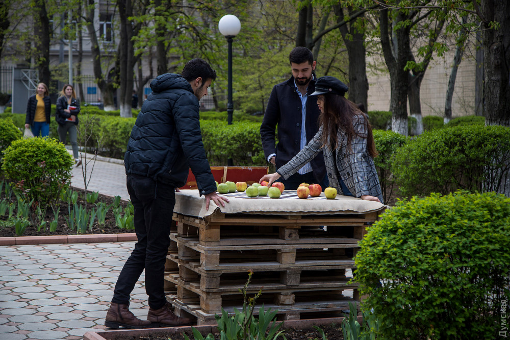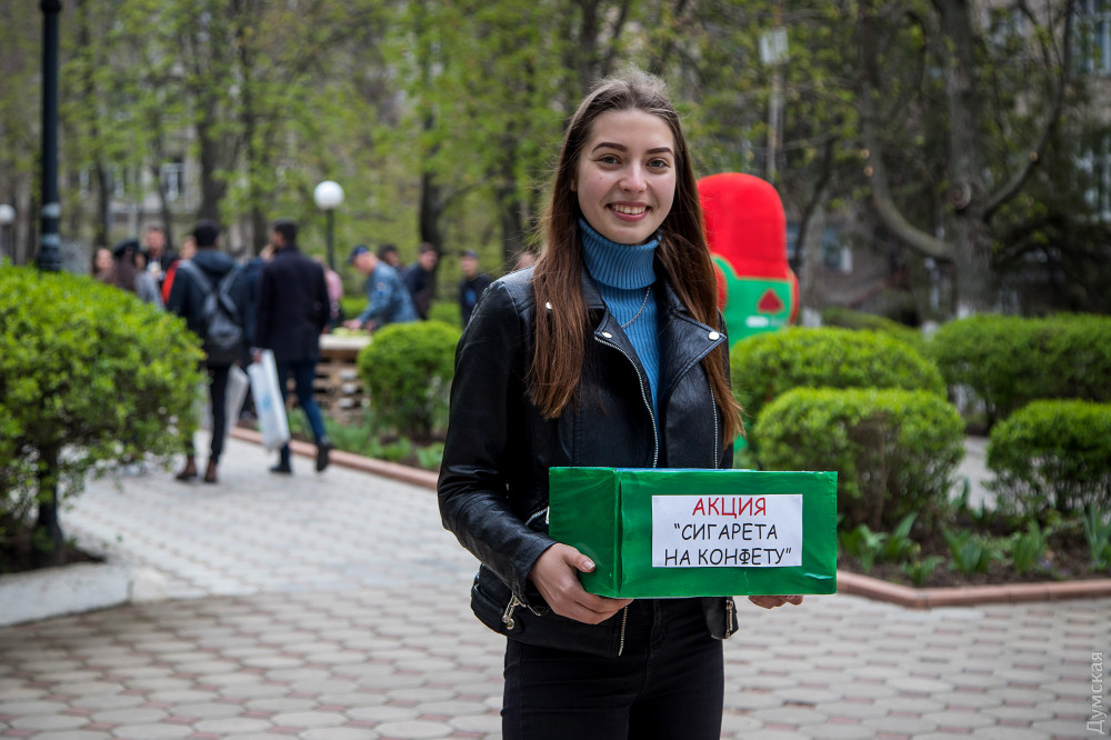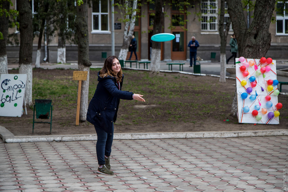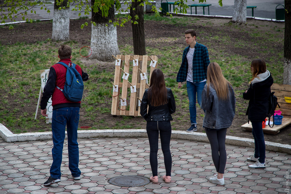 После зарядки — по кабинетам. Кто на пары, а кто и на научную конференцию по физике, проходившую в тот день в вузе. Спустя полтора часа студенты снова высыпают в сквер академии. Здесь их уже ждут забавные конкурсы и различные активности. Можно поиграть в боулинг с завязанными глазами, попрыгать в классики, покидать дротики и даже сыграть партию в шашки, где вместо фигур — яблоки. При этом по скверу ходят девушки, которые предлагают поменять сигареты на вкусные конфеты. Также работает мобильная амбулатория, где можно бесплатно проконсультироваться с врачом, проверить артериальное давление, рост и вес.