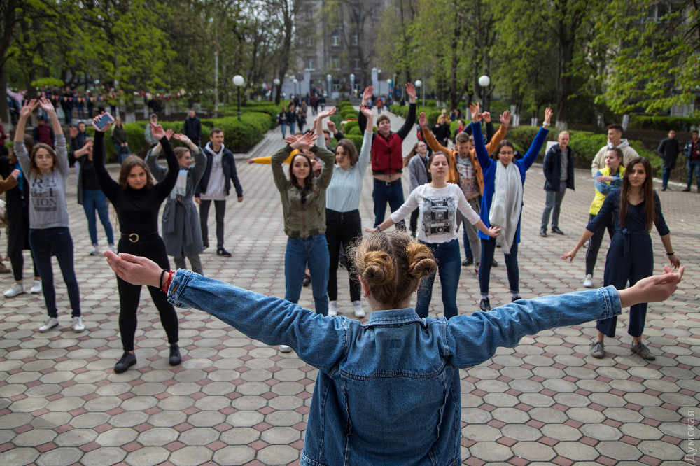Празднование Дня здоровья начинается с массовой зарядки. Студенты разогревают мышцы, затекшие от долгого стояния в маршрутках по пути на учебу. Эндорфины раскрашивают щеки румянцем и растягивают губы в улыбку — у студентов заметно улучшается настроение.