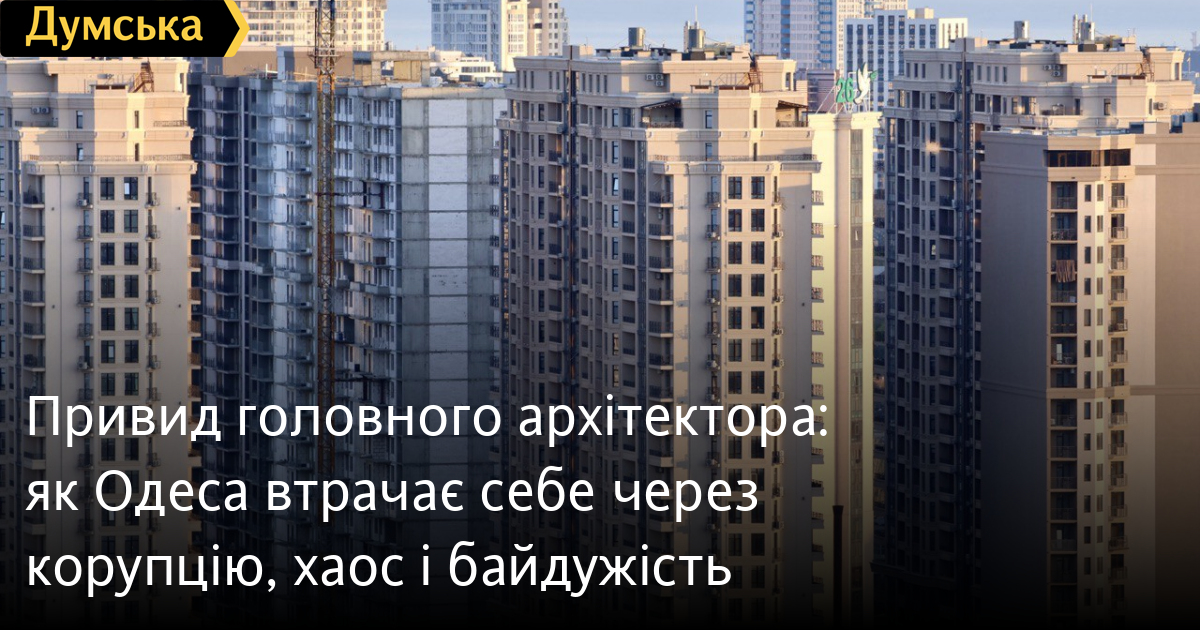 Привид головного архітектора: як Одеса втрачає себе через корупцію, хаос і байдужістьБагата архітектурна спадщина Одеси пережила і Другу світову, і радянський примітивізм. Але роки незалежності залишили на історичній забудові, включно з охоронною зоною ЮНЕСКО, важкі рани сучасною забудовою. Раніше питаннями архітектури займався профільний департамент мерії, нещодавно його об'єднали із земельним у нову мегаструктуру. Керувати новоутворенням належить Надії Новіковій. Є думка, що всі ці реформи й задумували, щоб саме вона могла керувати одночасно двома сферами. Офіційно ж об'єднання вимагає закон, воно спростить процеси, заощадить час і гроші на зарплатах. Але чи не важливіше розібратися: чому відповідальний за вигляд міста департамент (раніше — архітектури та містобудування) дає змогу девелоперам спотворювати центр та інші райони безликими людськими будівлями, позбавленими інфраструктури та будь-якої художньої цінності в принципі. Чому публічні зізнання «батьків міста» в любові до Одеси розходяться з небажанням (або нездатністю?) зупинити руйнівну діяльність забудовників? Хто несе відповідальність за архітектурний вигляд, і чому профільне управління не вирішує проблем? ЯК ПОВИННО БУТИ І ЯК Є НАСПРАВДІ Департамент архітектури та містобудування (поки ми говоримо про нього, трансформація в єдиний мегадепартамент — справа клопітка і нешвидка) — це ключовий орган, від якого залежить, якою побачать Одесу наші діти й онуки. В ідеальному світі ця структура разом з архітектурними контролерами (міський ДАБІ та держінспекція архітектури та містобудування — про них ми напишемо окремо) відповідає за розвиток міста: тут планують, де і що можна будувати, стежать за дотриманням архітектурних норм і розробляють проєкти благоустрою, тут обговорюють детальні плани територій. Городяни приходять сюди по дозволи на будівництво та реконструкцію, ремонт фасадів, встановлення реклами та тимчасових споруд. Департамент опікується і Генеральним планом, бере участь у розподілі землі під забудову і забезпечує відкритий доступ до містобудівної інформації. Він же має стежити за тим, щоб новобудови не шкодили культурній спадщині та зовнішньому вигляду міста. Головний архітектор, який мав стати рушійною силою розвитку міста в раціональному та естетичному ключі, перетворюється на клерка. А його головним інструментом стають дозволи і заборони. Ба більше, насправді останні п'ять років в Одесі в принципі немає директора департаменту й одночасно головного архітектора. Тільки в.о.
