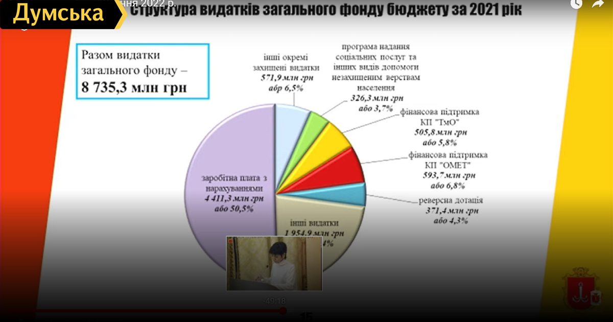 У Одессы возникли проблемы с наполнением бюджета развития — недополучили 74 млн грнДепартамент финансов Одесского горсовета отчитался сегодня об итогах выполнения бюджета за 2021 год. По словам заместителя городского головы Светланы Бедреги, в муниципальную казну поступило 9 миллиардов 397 миллионов гривен, что на 310 миллионов больше, чем было запланировано. 84% доходов — это поступления от налога на доходы физических лиц, платы за землю и единого налога. Еще 16 процентов – другие налоги и сборы общего фонда. Налог на доходы физлиц принес городу 5 миллиардов 639 миллионов, единый налог – 1 миллиард 611 миллионов, плата за землю – 681 миллион. Бедрега отметила, что были проблемы с бюджетом развития (расходуется на строительство и капремонты объектов инфраструктуры), который был утвержден в размере 230 миллионов гривен, однако реально город получил всего 156 миллионов. Расходы составили 8 миллиардов 735 миллионов. Больше половины – 4 млрд 411 миллионов пошло на заработные платы бюджетникам, 594 миллиона — на финансовую поддержку КП «Одесгорэлектротранс», 506 миллионов — на поддержку КП «Теплоснабжение города Одессы», реверсная дотация в госбюджет составила 371 миллион. Капитальные расходы бюджета развития составили 1 миллиард 581 миллион гривен. В проектах общественного бюджета задействовано 36,8 миллиона гривен. В депутатский фонд (проекты, которые инициируют пиара ради депутаты) заложили 191,5 миллионов, но реально потратили 171,3 миллиона. После отчета мэр Одессы Геннадий Труханов отметил, что бюджет развития города на 2022 год составит 200 млн грн. На ближайшей сессии, которая состоится 9 февраля, депутаты должны решить, на какие объекты будут потрачены эти деньги. По данным «Думской», деньги пойдут на проекты «Великого будівництва» Владимира Зеленского. СМЕРТЬ РОСІЙСЬКИМ ОКУПАНТАМ! Помітили помилку? Виділяйте слова з помилкою та натискайте control-enter