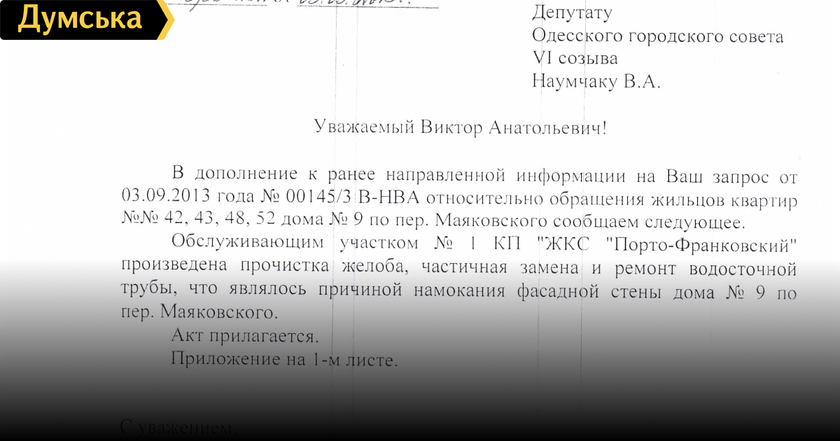 «На мои неоднократные письменные обращения в адрес руководства ЖКС «Порто-Франковский» я получал ответы о том, что «кровля техэтажного флигеля, где расположены квартиры №№ 42, 43, 48, 52 находится в удовлетворительном состоянии», — рассказал Виктор Наумчак. — На лицо либо полная некомпетентность сотрудников ЖКС «Порто-Франковский», либо преступная халатность с их стороны. Как депутат данного округа, требую от г-на Орловского А.И., заместителя городского головы курирующего вопросы ЖКХ, срочно провести восстановительные работы в указанной квартире и разобраться в причинах бездействия ЖКС «Порто-Франковский», выявить виновных и самым строгим образом наказать их с целью недопущения повторения таких ситуаций».