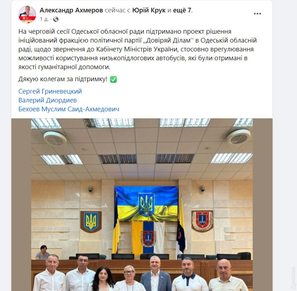«Довіряєць» Олександр Ахмеров (директор міського департаменту комунальної власності Одеси) із 43 питань, розглянутих депутатами, теж виокремив звернення до уряду, але вже з приводу використання низькопідлогових автобусів-гармошок, які місто отримало від Регенсбурга. Нагадаємо, їх здуру оформили як гумдопомогу, через що машини не можна використовувати як громадський транспорт, оскільки це комерційна діяльність.