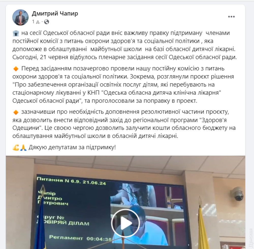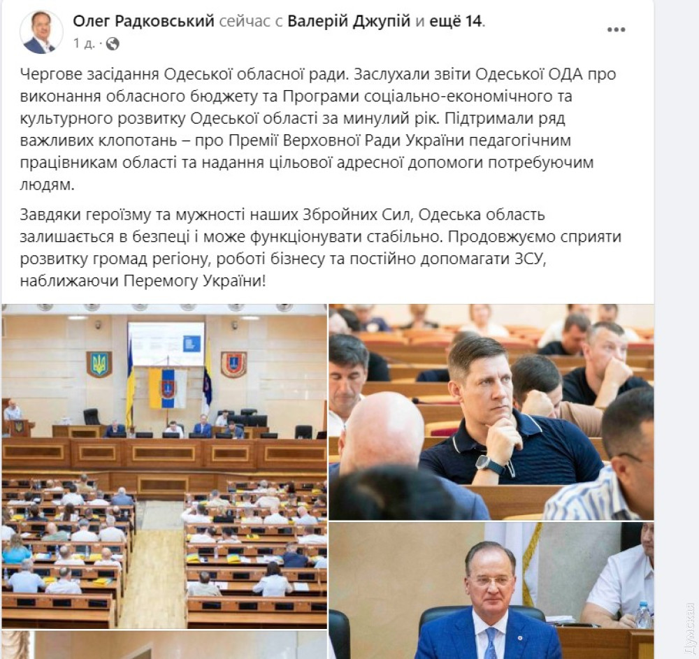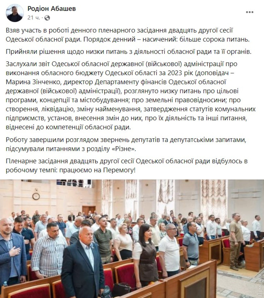 «Пленарне засідання 21 сесії Одеської облради пройшло в робочому темпі. Працюємо на Перемогу!» — пафосно заявив представник фракції Родіон Абашев.