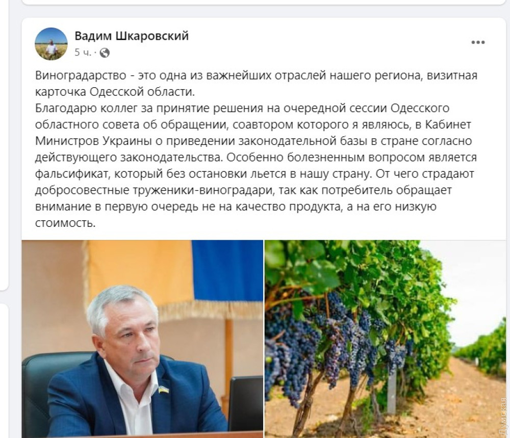 Так, скандально відомий заступник голови ради від забороненої ОПЗЖ Вадим Шкарівський, схоже, цікавиться лише виноградарством — він був співавтором звернення до Кабміну щодо проблем галузі.