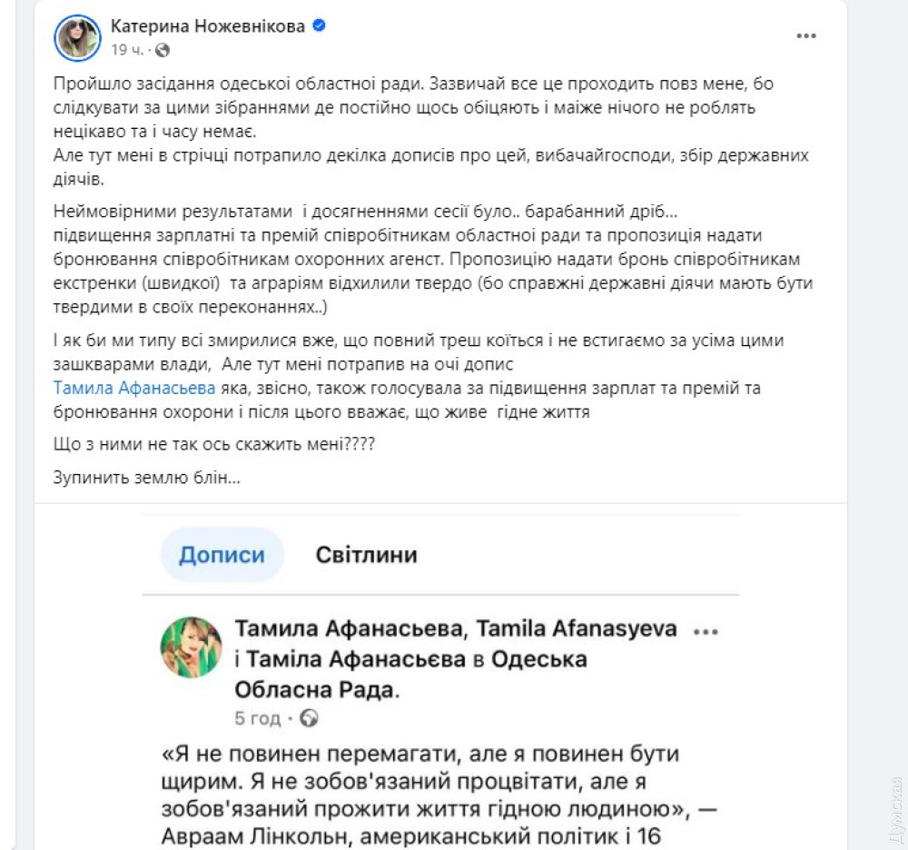 І начебто ми типу всі змирилися вже, що повний треш коїться, і не встигаємо за всіма цими зашкварами влади, але тут мені попалося на очі повідомлення Таміли Афанасьєвої, яка, звісно, теж голосувала за підвищення зарплат і премій, за бронювання охорони, і після цього вважає, що живе гідним життям. Що з ними не так ось скажіть мені????