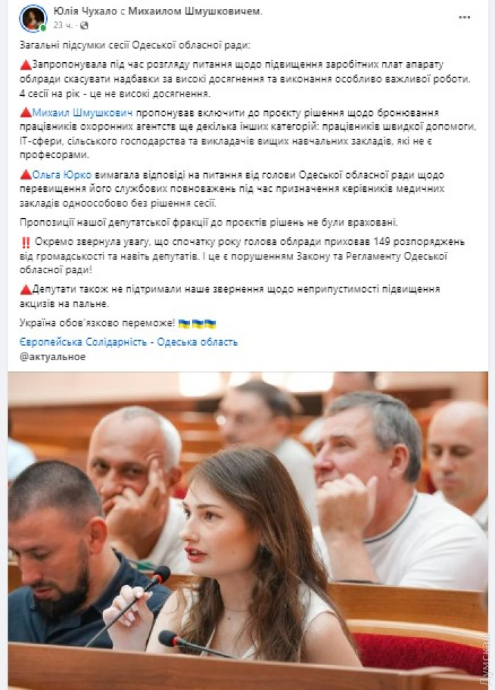 Це, повторимося, представники більшості. Опозиціонери (справжні) з «Європейської Солідарності» оцінюють сесію не настільки позитивно. Депутат Юлія Чухало послідовно перераховує сумнівні рішення, які посоромилися згадати її опоненти: