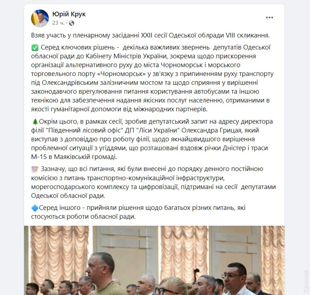 Звернення до уряду згадав і інший соратник Труханова Юрій Крук. Одне з них стосується організації альтернативного шляху сполучення між Одесою та Чорноморськом: зараз воно ускладнене через удари росіян по Олександрівському залізничному мосту, під яким проходить автошлях.