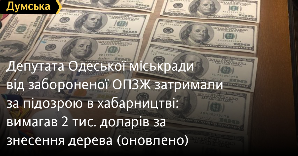 Правоохоронці затримали ОПЗЖшника після отримання ним на криптовалютний рахунок 5 тисяч доларів за безперешкодне отримання акта про обстеження ще одного аварійного зеленого насадження в центрі міста.