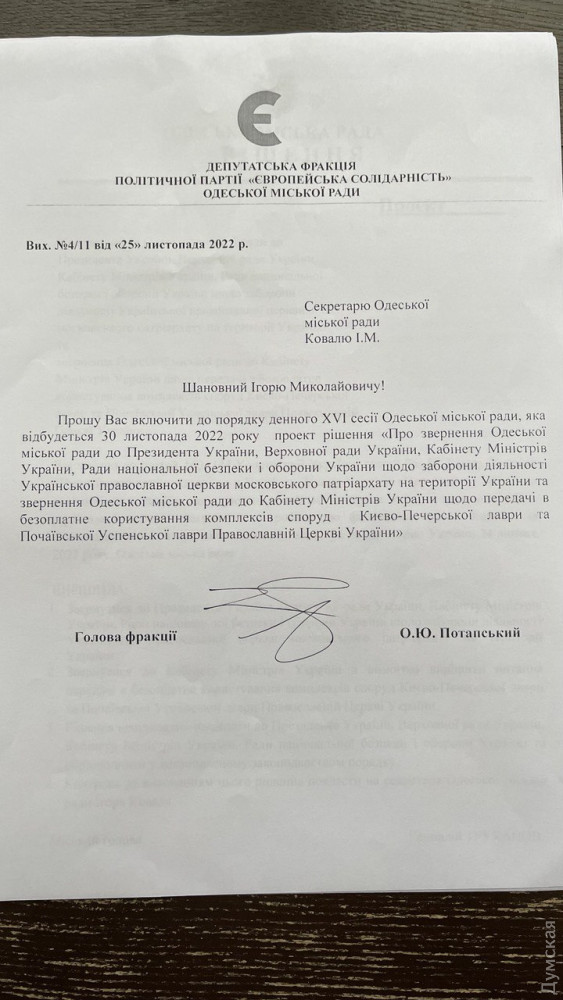 За заборону діяльності УПЦ Московського патріархату запропонують проголосувати депутатам Одеської міської ради представники «Євросолідарності».