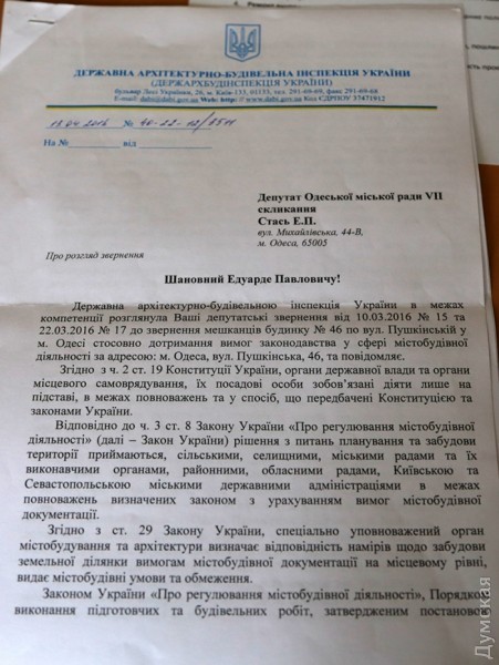 Ознакомившись с обращением граждан, Эдуард Стась направил ряд депутатских обращений в управление культуры и охраны объектов культурного наследия облгосадминистрации, в управление по вопросам охраны объектов культурного наследия Одесского городского совета, в Департамент ГАСК в Одесской области, в Департамент ГАСК Украины, начальникам ряда управлений городского совета, в том числе капитального строительства, архитектуры и градостроительства, земельных ресурсов, а также в Приморскую районную администрацию.