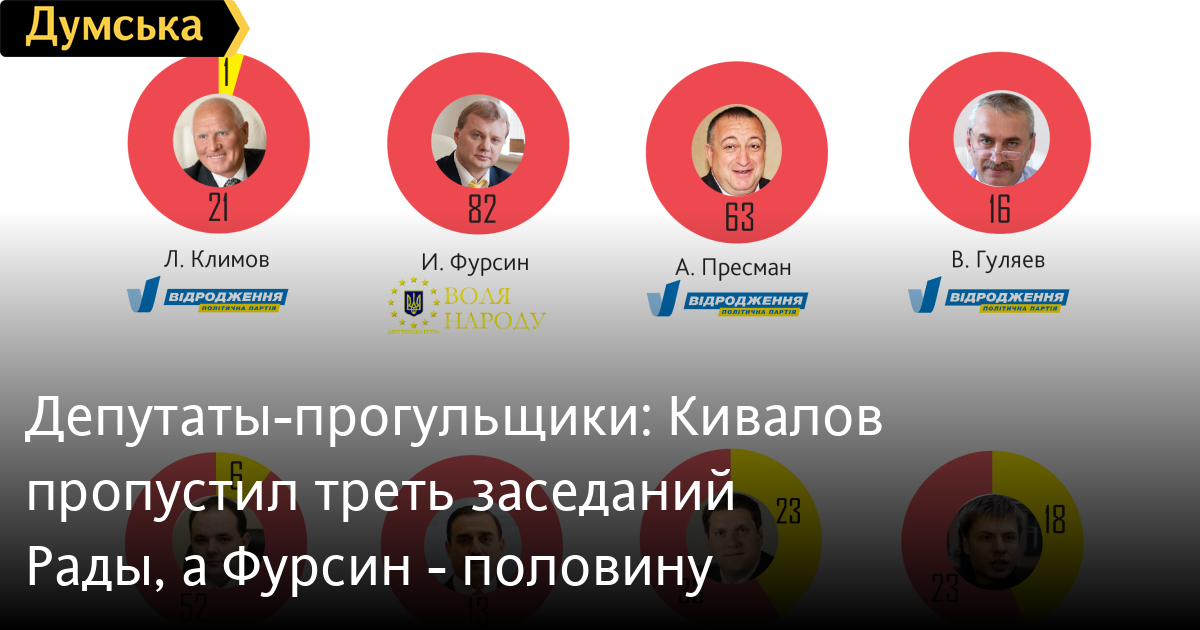 Лидером по прогулам стал нардеп Иван Фурсин, который не явился в парламент 82 раза (49%). Второе место у Евгения Дейдея, пропустившего 68 заседаний (40%).