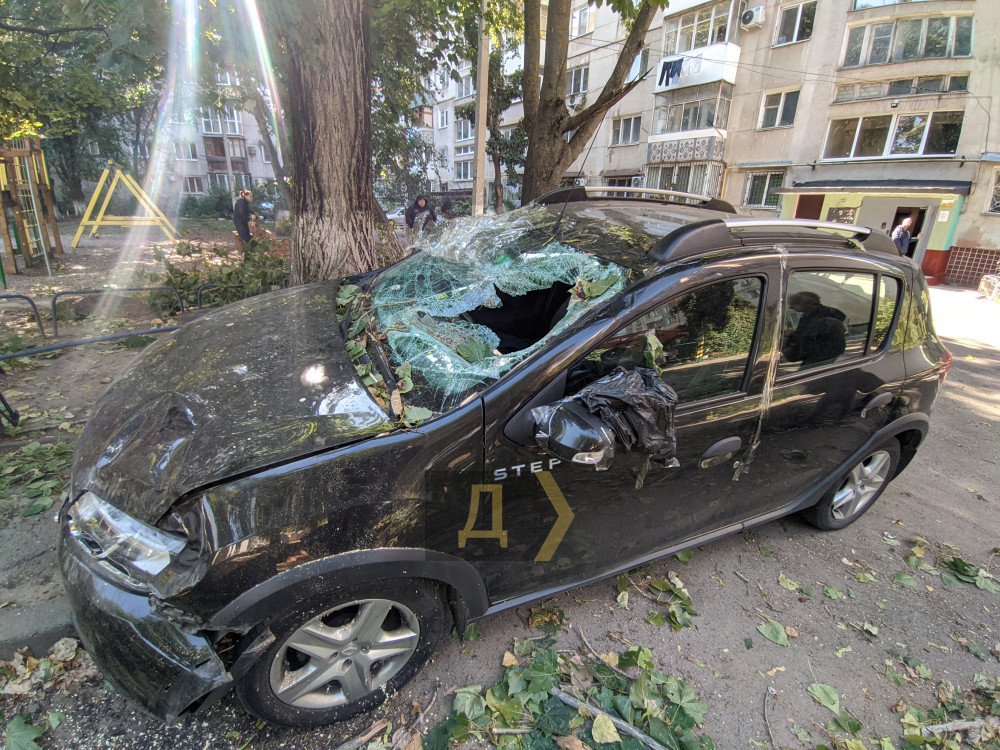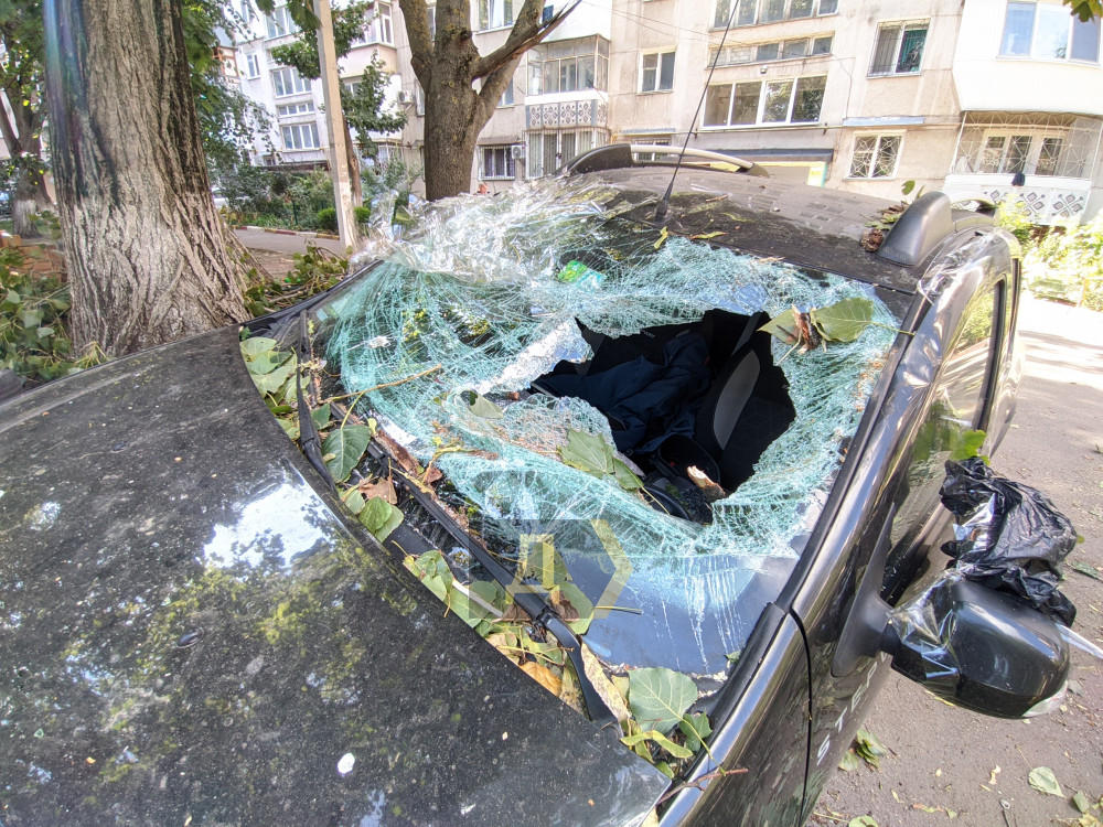 Основной удар ветки тополя диаметром около 70 сантиметров приняли на себя два автомобиля. Особенно сильно пострадал автомобиль Renault: одна из боковых веток пробила лобовое стекло, осколки сейчас лежат на водительском сиденье вместе с листьями и обломками древесины.