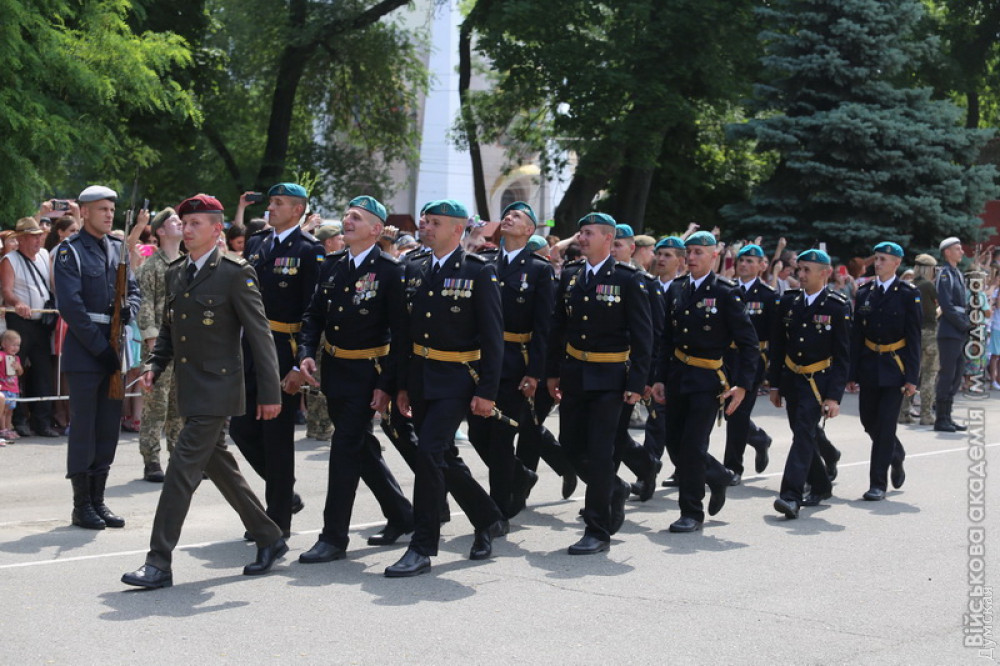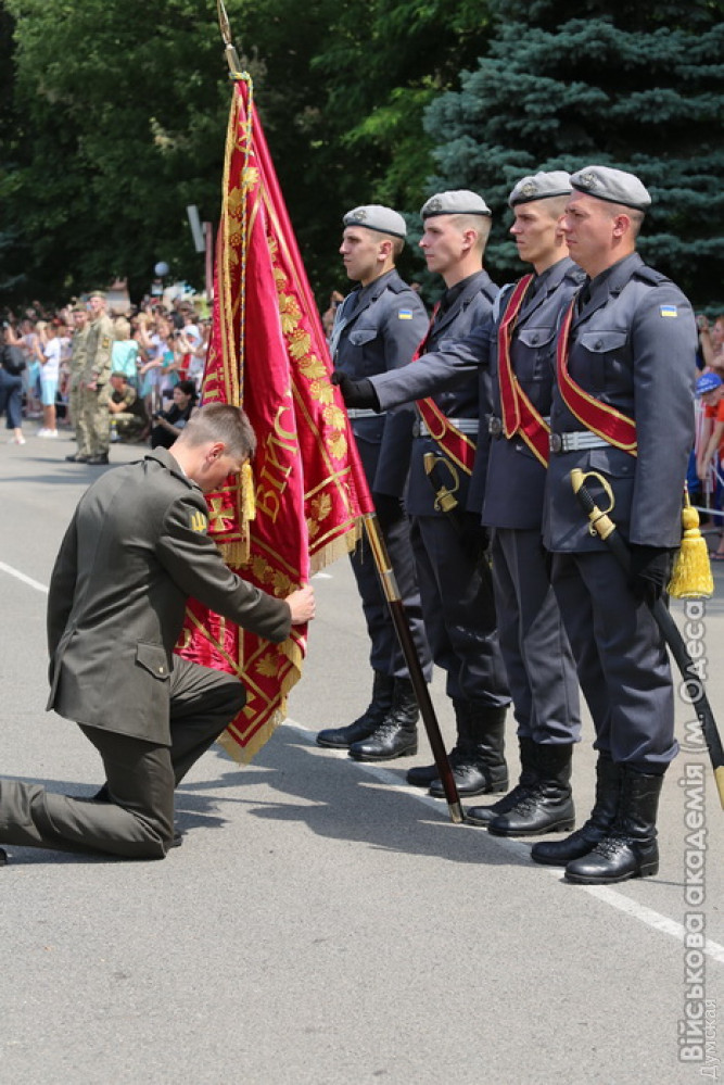Первые офицерские погоны военнослужащие получили еще вчера, после ритуала последней вечерней поверки, который прошел у мемориала «Крылья Победы» на площади 10 Апреля. Сегодня на плацу академии состоялся собственно выпуск. В церемонии участвовал начальник Генштаба — главнокомандующий Вооруженными силами Украины генерал-лейтенанат Руслан Хомчак.