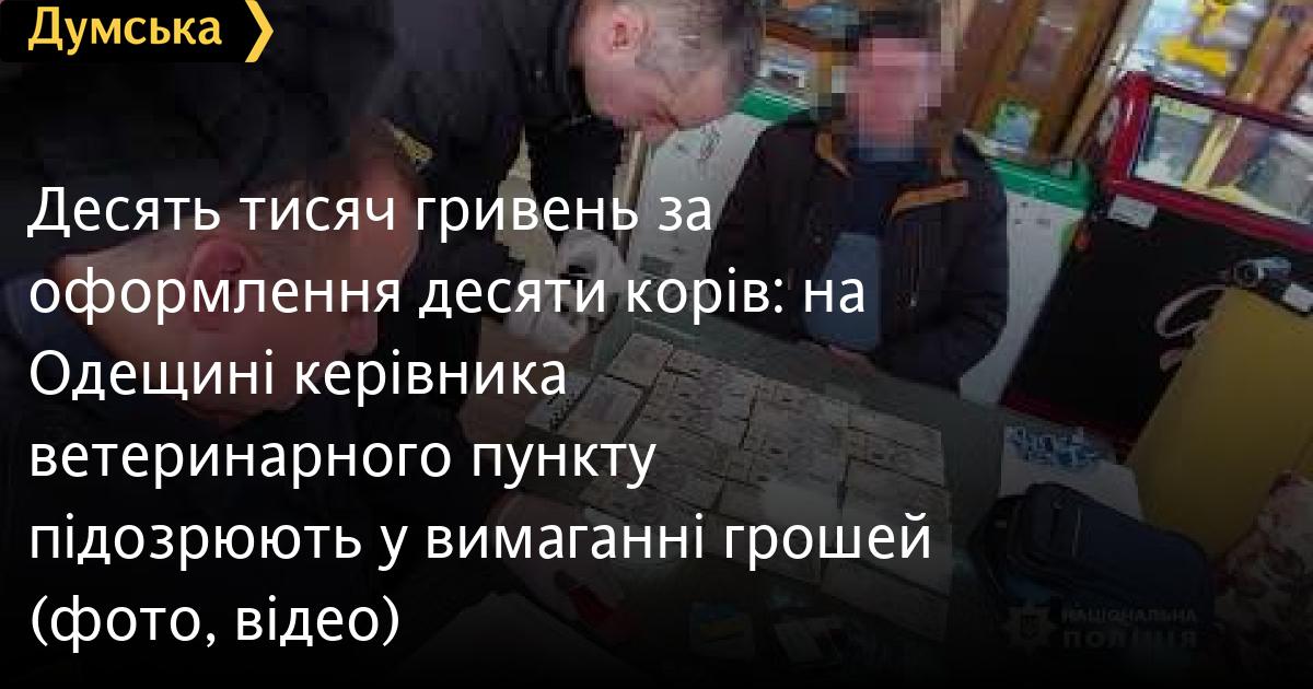 Десять тисяч гривень за оформлення десяти корів: на Одещині керівника ветеринарного пункту підозрюють у вимаганні грошей (фото, відео)Завідувача ветеринарного пункту на Одещині підозрюють у вимаганні грошей за державну реєстрацію корів, ціна питання — тисяча гривень за тварину. Затримали чоловіка після отримання десяти тисяч гривень від фермера, який розводить велику рогату худобу, повідомили в поліції регіону. Як заявляє фермер, керівник ветеринарної дільниці в Білгород-Дністровському районі вимагав десять тисяч гривень за виготовлення паспортів для десяти корів. Слідство вважає, що 45-річний посадовець поставив ультиматум: якщо йому заплатять, то він прискорить процедуру реєстрації корів, швидко проведе клінічний огляд та засвідчить відповідність даних про тварин відомостями і не буде чинити перешкоди реєстрації, переміщенню до нового місця утримання та в отриманні паспортів на них. Інакше фігурант обіцяв ускладнити процедуру і затягнути її до півроку і навіть зазначити, що худоба хвора. Затриманому повідомили про підозру у проханні надати вигоду для себе та одержанні службовою особою неправомірної вигоди для себе за вчинення такою службовою особою в інтересах того, хто надає неправомірну вигоду, дії з використанням службового становища. Тепер посадовцю загрожує від 17 000 гривень штрафу до чотирьох років за ґратами, з позбавленням права обіймати певні посади чи займатися певною діяльністю на строк до трьох років. Вирішується питання про обрання підозрюваному запобіжного заходу та відсторонення від посади. Над справою працювали поліцейські з управління стратегічних розслідувань в Одеській області та Білгород-Дністровського райвідділу під процесуальним керівництвом Білгород-Дністровської окружної прокуратури. СМЕРТЬ РОСІЙСЬКИМ ОКУПАНТАМ! Помітили помилку? Виділяйте слова з помилкою та натискайте control-enter Новини по цій темі: 12 серпня 2025: Як у кіно: в Одесі затримали драгдилера з партією психотропів на 20 мільйонів (фото) 9 серпня 2025: Обіцяла «закрити очі» на порушення: працівницю Одеської митниці спіймали на хабарі у чверть мільйона гривень 4 серпня 2025: Експертизу не зробили, камери не подивилися: одеські волонтери скаржаться на саботаж поліції у розслідуванні вбивства собаки 29 липня 2025: В Усатово Одеської області сталася перестрілка: поліція працює на місці (відео, оновлено) |