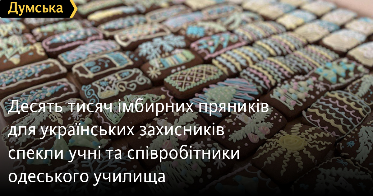 Десять тисяч імбирних пряників для українських захисників спекли учні та співробітники одеського училищаДесять тисяч імбирних пряників до новорічних і різдвяних свят спекли для українських захисників учні та педагоги Одеського вищого професійного училища морського туристичного сервісу в рамках акції «Тепла хвиля». Як повідомили в одеській мерії, пряники вирушать до українських воїнів, котрі зараз проходять лікування в одеських лікарнях. Крім того, частину пряників передадуть в освітні установи Миколаєва. Ще частину роздадуть одеським дітям. СМЕРТЬ РОСІЙСЬКИМ ОКУПАНТАМ! Помітили помилку? Виділяйте слова з помилкою та натискайте control-enter |