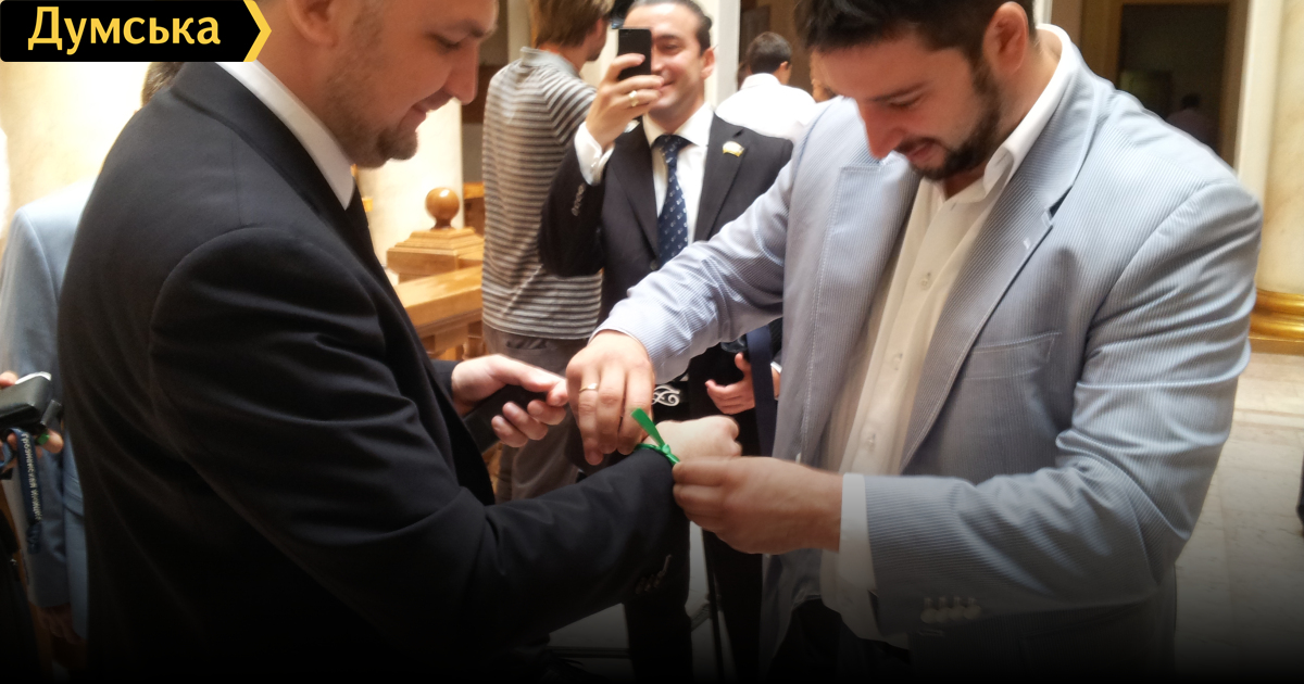 Активист "Генерального протеста", депутат горсовета Игорь Димитриев повязывает зеленую ленту Александру Ахмерову