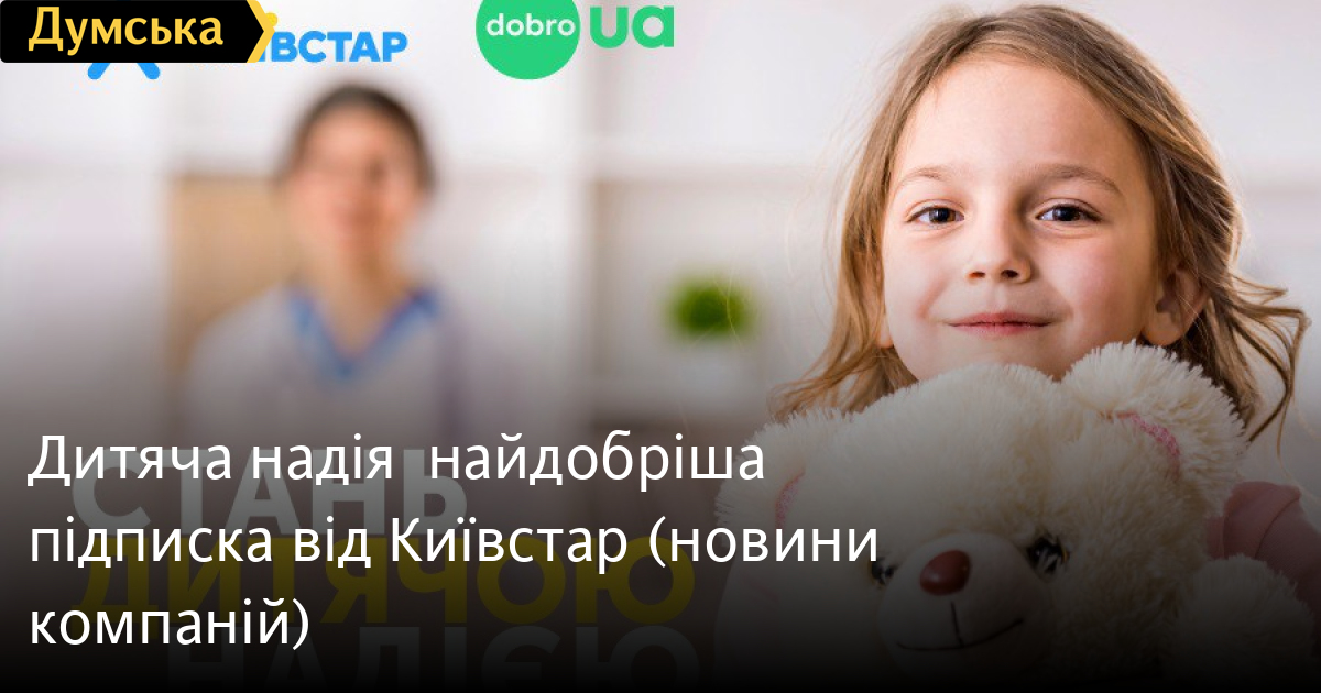 Мета проекту «Дитяча надія» — забезпечити онко- та кардіовиділення в українських лікарнях життєво необхідним обладнанням для швидкого одужання маленьких пацієнтів. Київстар спільно з Українською біржею благодійності (нині – dobro.ua) ще наприкінці 2018 року створив прозорий та простий інструмент допомоги – систему благодійних SMS, яка надає абонентам передоплати мобільного оператора можливість перераховувати кошти на благодійність швидко та зручно.