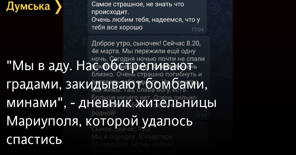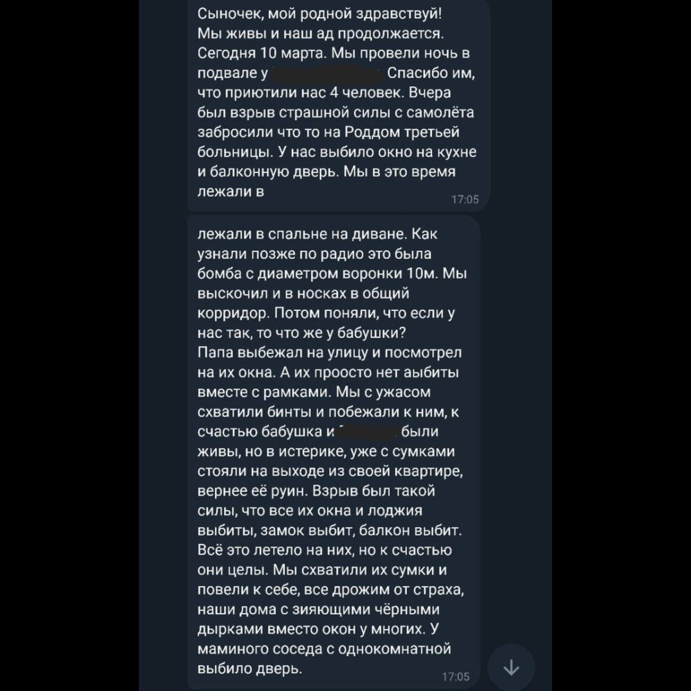 Доброе утро, сыночек! Сейчас 08:20 4-е марта. Мы пережили еще одну ночь. Сегодня ночью почти не спали, бомбили нещадно. Кажется, очень близко. Очень страшно погибнуть и оставить тебя одного. Но уже утро, мы живы. Газ, слава богу, есть. Больше ничего нет. Очень сильно тебя любим, береги себя, наш родной.