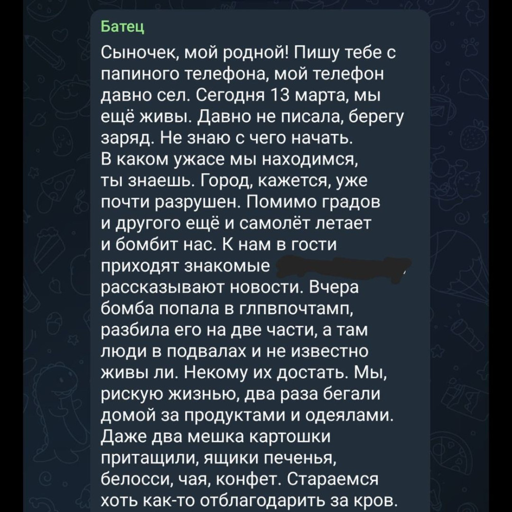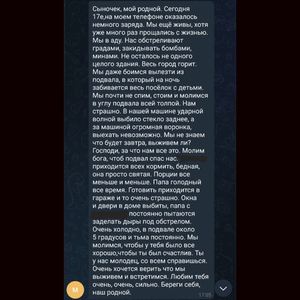 Сыночек, мой родной. Сегодня 17-е, на моем телефоне оказалось немного заряда. Мы еще живы, хотя уже много раз прощались с жизнью. Мы в аду. Нас обстреливают градами, закидывают бомбами, минами. Не осталось ни одного целого здания. Весь город горит. Мы даже боимся вылезти из подвала, в который на ночь забивается весь поселок с детьми. Мы почти не спим, стоим и молимся в углу подвала всей толпой. Нам страшно. В нашей машине ударной волной выбило стекло заднее, а за машиной огромная воронка, выехать невозможно. МЫ не знаем, что будет завтра, выживем ли? Господи, за что нам все это. Молим бога, чтоб подвал спас нас. Порции все меньше и меньше. Папа голодный все время. Готовить приходится в гараже и то очень страшно. Окна и двери в доме выбиты, папа с …….. постоянно пытаются заделать дыры под обстрелом. Очень холодно, в подвале около 5 градусов и тьма постоянно. Мы молимся, Чтобы у тебя было все хорошо, чтоб ты был счастлив. Ты у нас молодец, со всем справишься. Очень хочется верить, что мы выживем и встретимся. Любим тебя очень, очень сильно. Береги себя, наш родной.