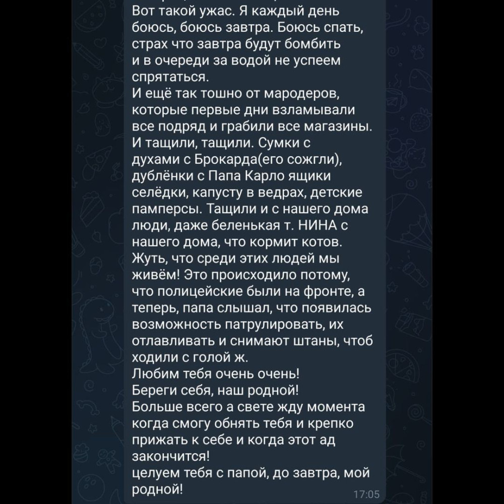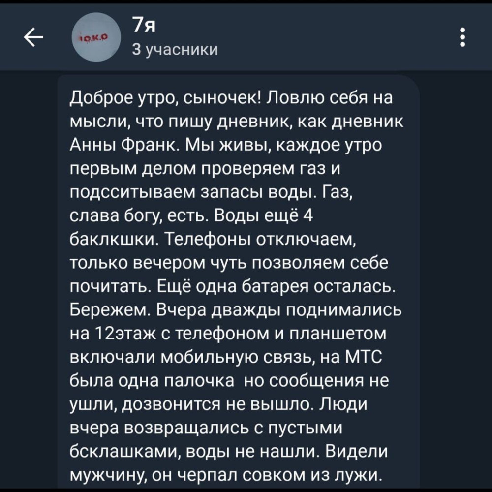 Доброе утро, сыночек! Ловлю себя на мысли, что пишу дневник, как дневник Анны Франк. Мы живы, каждое утро первым делом проверяем газ и подсчитываем запасы воды. Газ, слава богу, есть. Воды еще 4 баклажки. Телефоны отключаем, только вечером чуть позволяем себе почитать. Еще одна батарея осталась. Бережем. Вчера дважды поднималась на 12 этаж с телефоном и планшетом, включали мобильную связь, на МТС была одна палочка, но сообщения не ушли, дозвониться не вышло. Люди вчера возвращались с пустыми баклажками, воды не нашли. Видели мужчину, он черпал совком лужи. Вот такой ужас. Я каждый день боюсь, боюсь завтра. Боюсь спать, страх, что завтра будут бомбить, и в очереди за водой не успеем спрятаться. И еще так тошно от мародеров, которые первые дни взламывали все подряд и грабили все магазины. И тащили, тащили. Сумки с духами из Брокарда (его сожгли), дубленки с Папа Карло, ящики селедки, капусту в ведрах, детские памперсы. Тащили и из нашего дома люди, даже беленькая т. Нина с нашего дома, что кормит котов. Жуть, что среди этих людей мы живем! Это происходило потому, что полицейские были на фронте, а теперь, папа слышал, что появилась возможность патрулировать, их отлавливают и снимают штаны, чтоб ходили с голой ж. Любим тебя очень! Береги себя, наш родной! Больше всего на свете я жду момента, когда смогу тебя обнять и крепко прижать к себе, и когда этот ад закончится! Целуем тебя с папой, до завтра, мой родной!