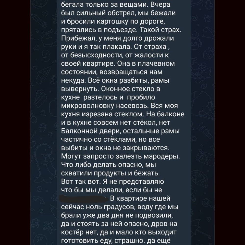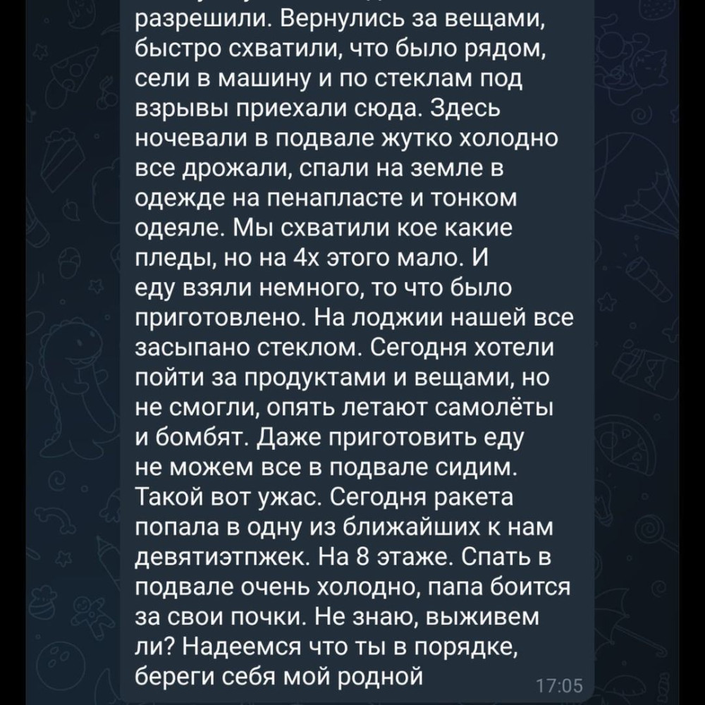 Вернулись за вещами, быстро схватили, что было рядом, сели в машину и по стеклам под взрывы приехали сюда. Здесь ночевали в подвале, жутко холодно, все дрожали, спали на земле в одежде на пенопласте и тонком одеяле. Мы схватили кое-какие пледы, но на 4х этого мало. И еду взяли немного, то что было приготовлено. На лоджии нашей все засыпано стеклом. Сегодня хотели пойти за продуктами и вещами, но не смогли, опять летают самолеты и бомбят. Даже приготовить еду не можем, все в подвале сидим. Такой вот ужас. Сегодня ракета попала в одну из ближайших к нам девятиэтажек. На 8 этаже. Спать в подвале очень холодно. Папа боится за свои почки. Не знаю, выживем ли? Надеемся, что ты в порядке, береги себя мой родной.