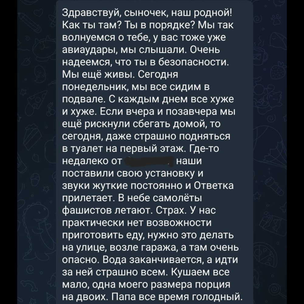 Здравствуй, сыночек, наш родной! Как ты там? Ты в порядке? Мы так волнуемся о тебе, у вас тоже уже авиаудары, мы слышали. Очень надеемся, что ты в безопасности. Мы еще живы. Сегодня понедельник, мы все сидим в подвале. С каждым днем все хуже и хуже. Если вчера и позавчера мы еще рискнули сбегать домой, то сегодня, даже страшно подняться в туалет на первый этаж. Где-то недалеко от …… наши поставили свою установку и звуки жуткие постоянно и ответка прилетает. В небе самолеты фашистов летают. Страх. У нас практически нет возможности приготовить еду, нужно это делать на улице, возле гаража, а там очень опасно. Вода заканчивается, а идти за ней страшно всем. Кушаем все мало, одна моего размера порция на двоих. Папа все время голодный.