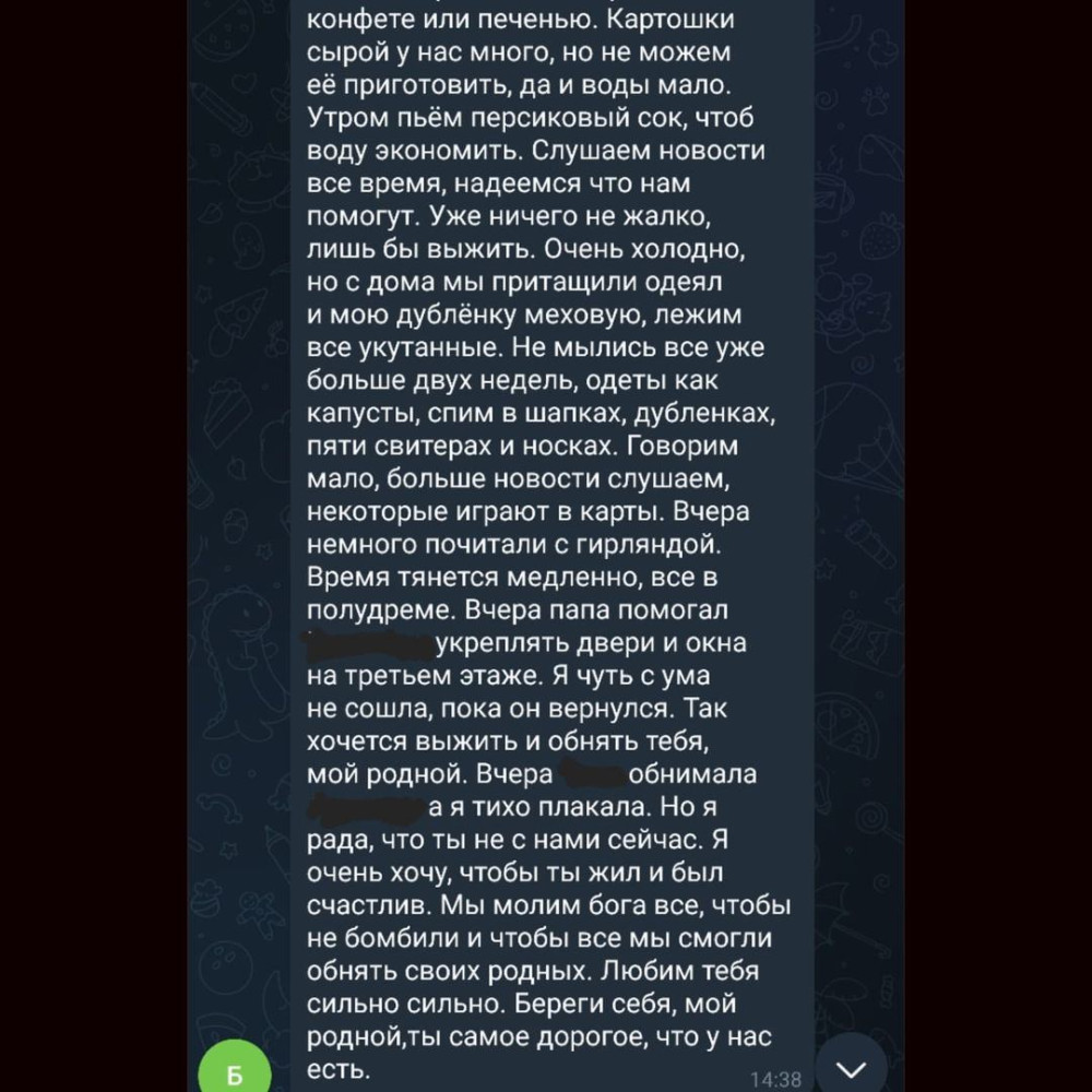 Картошки сырой у нас много, но не можем ее приготовить, да и воды мало. Утром пьем персиковый сок, чтоб воду экономить. Слушаем новости все время, надеемся, что нам помогут. Уже ничего не жалко, лишь бы выжить. Очень холодно, но из дома мы притащили одеял и мою дубленку меховую, лежим все укутанные. Не мылись все уже больше двух недель, одеты как капусты, спим в шапках, дубленках, пяти свитерах и носках. Говорим мало, больше новости слушаем, некоторые играют в карты. Вчера немного почитали с гирляндой. Время тянется медленно, все в полудреме. Вчера папа помогал ……… укреплять двери и окна на третьем этаже. Я чуть с ума не сошла, пока он вернулся. Так хочется выжить и обнять тебя, мой родной. Но я рада, что ты не с нами сейчас. Я очень хочу, чтобы ты жил и был счастлив. Мы молим бога все, чтобы не бомбили, и чтобы все мы смогли обнять своих родных. Любим тебя сильно-сильно. Береги себя, мой родной, ты - самое дорогое, что у нас есть.