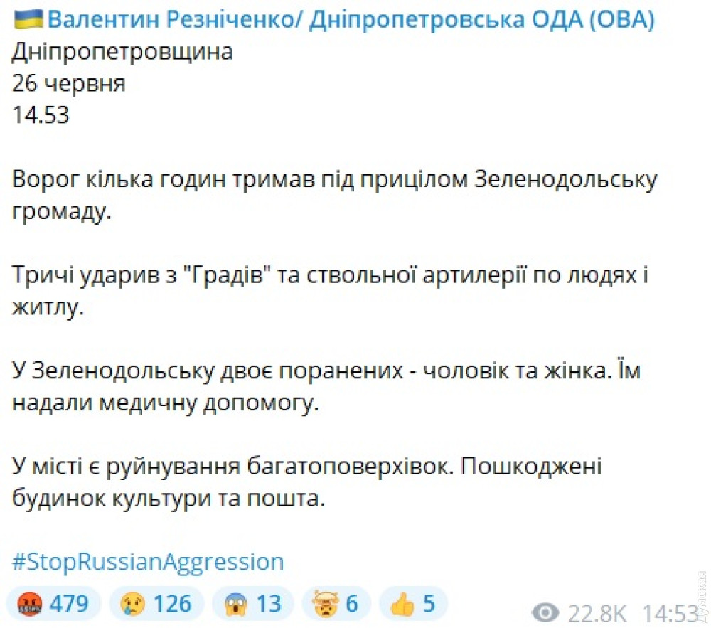 «Враг несколько часов держал под прицелом Зеленодольскую громаду. Трижды ударил из «Градов» и ствольной артиллерии по людям и жилью. В Зеленодольске двое раненых – мужчина и женщина. Им оказали медицинскую помощь», — написал Резниченко.