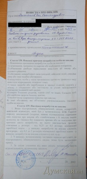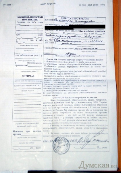 «Я был задержан как особо опасный преступник, но потом оказалось, что я всего лишь свидетель», — комментирует Олег Долженков. Ему была предъявлена факсовая копия повестки без даты и времени, которой его вызывали в Главное следственное управление СБУ для допроса в качестве свидетеля по делу о сепаратизме («делу Антона Давидченко»). На следующий день сотрудники спецслужбы отвезли его в здание МВД Украины на ул Богомольца, где он был допрошен — снова как свидетель — по делу о массовых беспорядках 2 мая.