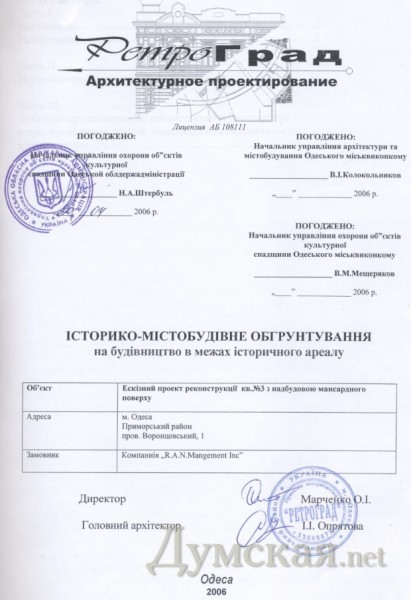 По словам Мещерякова, заказчик работ – американская компания R.A.N Management Inc. (зарегистрирована двадцать лет назад в Бруклине, штат Нью-Йорк) – начала вести переговоры с областной и городской властью еще в 2006-м году. «Дело в том, что на части здания – если стоять к нему лицом, слева — уже существует мансарда. Заказчик предложил сделать точно такую же над своей квартирой, то есть, условно говоря, восстановить целостность памятника. По эскизу мансарда удачно вписывалась во внешний облик здания и была практически незаметной. И тем не менее, по ряду причин я отказался ставить свою подпись на историко-градостроительном обосновании. Это сделала начальник облуправления охраны памятников Наталья Штербуль», — сказал специалист.